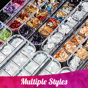 【36 CASES FOIL NAIL FLAKES】- in different color(golden, silver, copper, blue, green, red, black, purple, holographic silver & rose gold etc.) These light, thin foils are very easy to ripped and applied. Don’t leave the polish lumpy. Go on smoothly and stays on well. The colors show through on acrylic and polygel beautifully- liked the shiny bright metallic foils. Once they hit the light the shine is amazing and foil nail arts last for a long time.