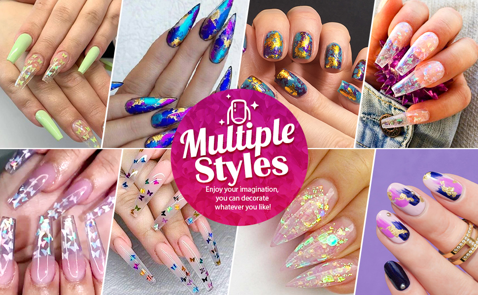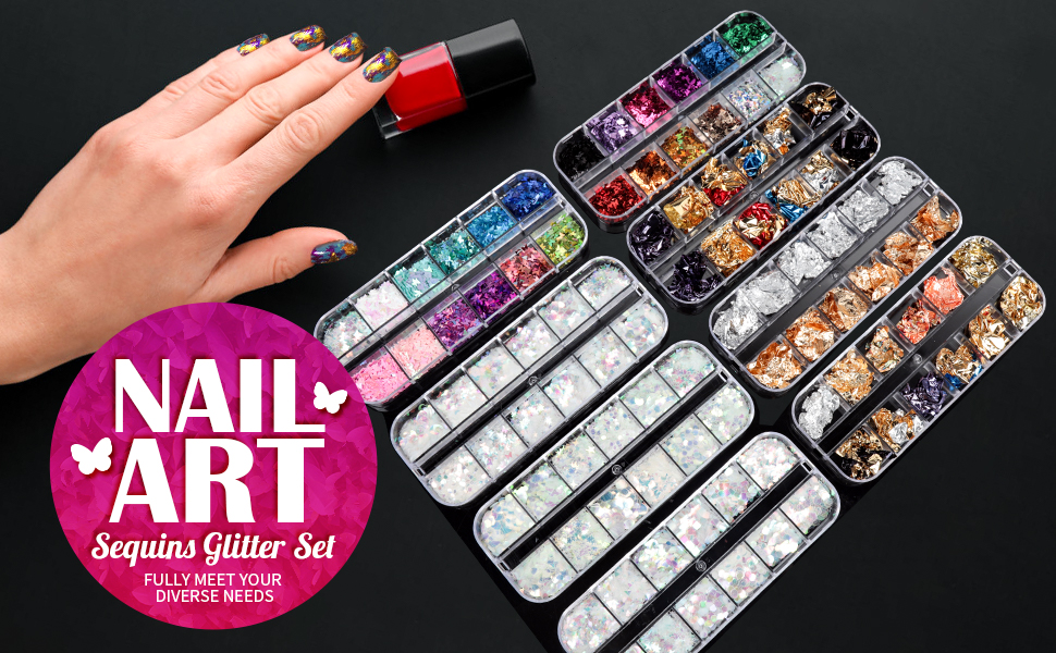 【PACKAHE INCLUDES】- 8 box/set, each boxes with 12 grids. This nail sequins set included 3 patterns: butterfly, Mermaid glitters& foils with different color and shapes which easily create your nail arts you want