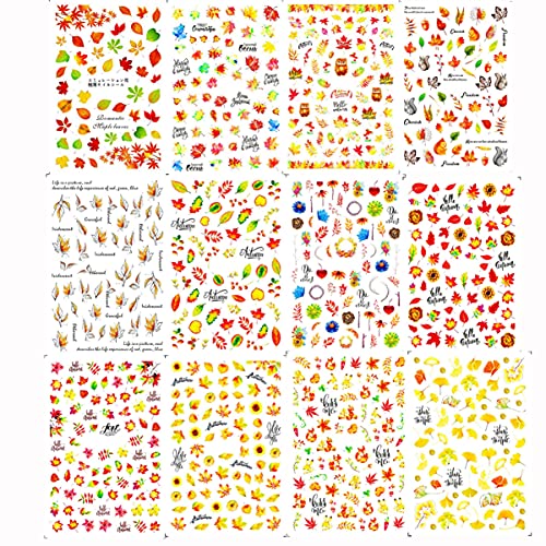 12 Sheets Autumn Nail Art Decals Fall Maple Leaf Nail Stickers for Nail Art Leave Flower Squirrel Nail Art Supplies 3D Nail Decoration Kit Women Kids Girls Nail Charms Nail Decals for Acrylic Nails