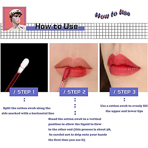 [How to Use] — Split the cotton swab along the side marked by the horizontal line of the cotton swab, and let the cotton swab stand upright to allow the liquid to flow to the other end (this process is about 2 seconds, be careful not to drip onto your hands the first time you use it) , Use a cotton swab to evenly fill the upper and lower lips.