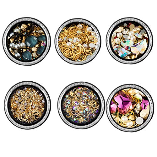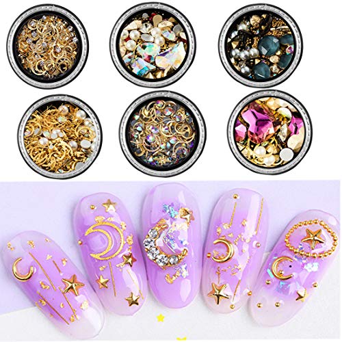 6 Boxes 3D Mix-shape Metal Nail Studs Big Gem Pearls Nail Art Rhinestone Nail Rivet Stars Moons Diamonds Jewels Decoration Kit for Women Manicure Wraps Fingernail Tips Accessories