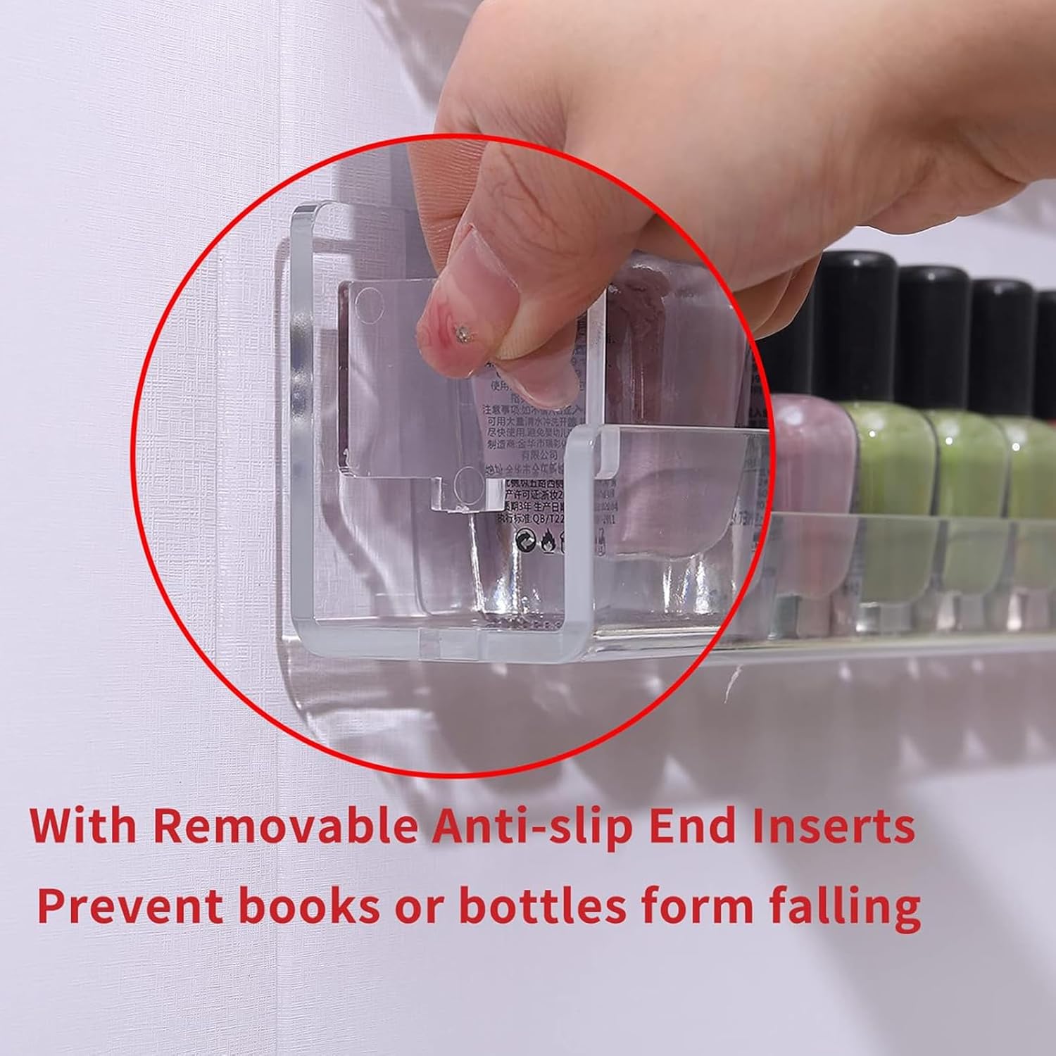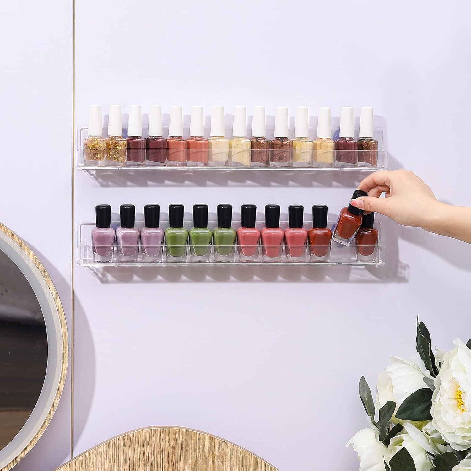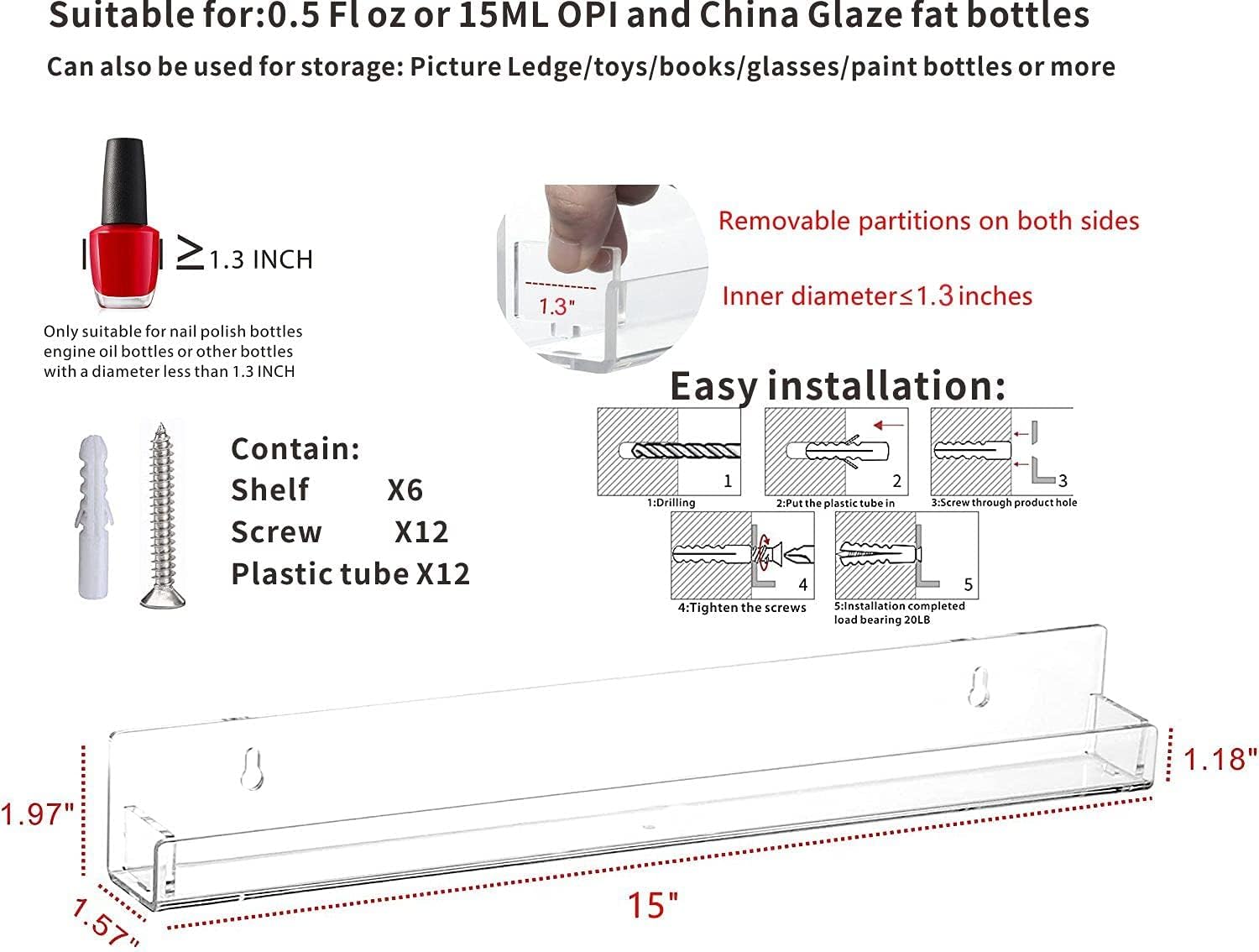 A set of 6 tier – it is equipped with 6 acrylic nail polish racks,with crystal transparent shelves and railings, providing maximum visibility for your nail polish series. Each wall floating rack is separate, which can be installed in rows or separately according to your preference. The size is 15 “Lx1.57” W, which can accommodate approximately 10-15 bottles.