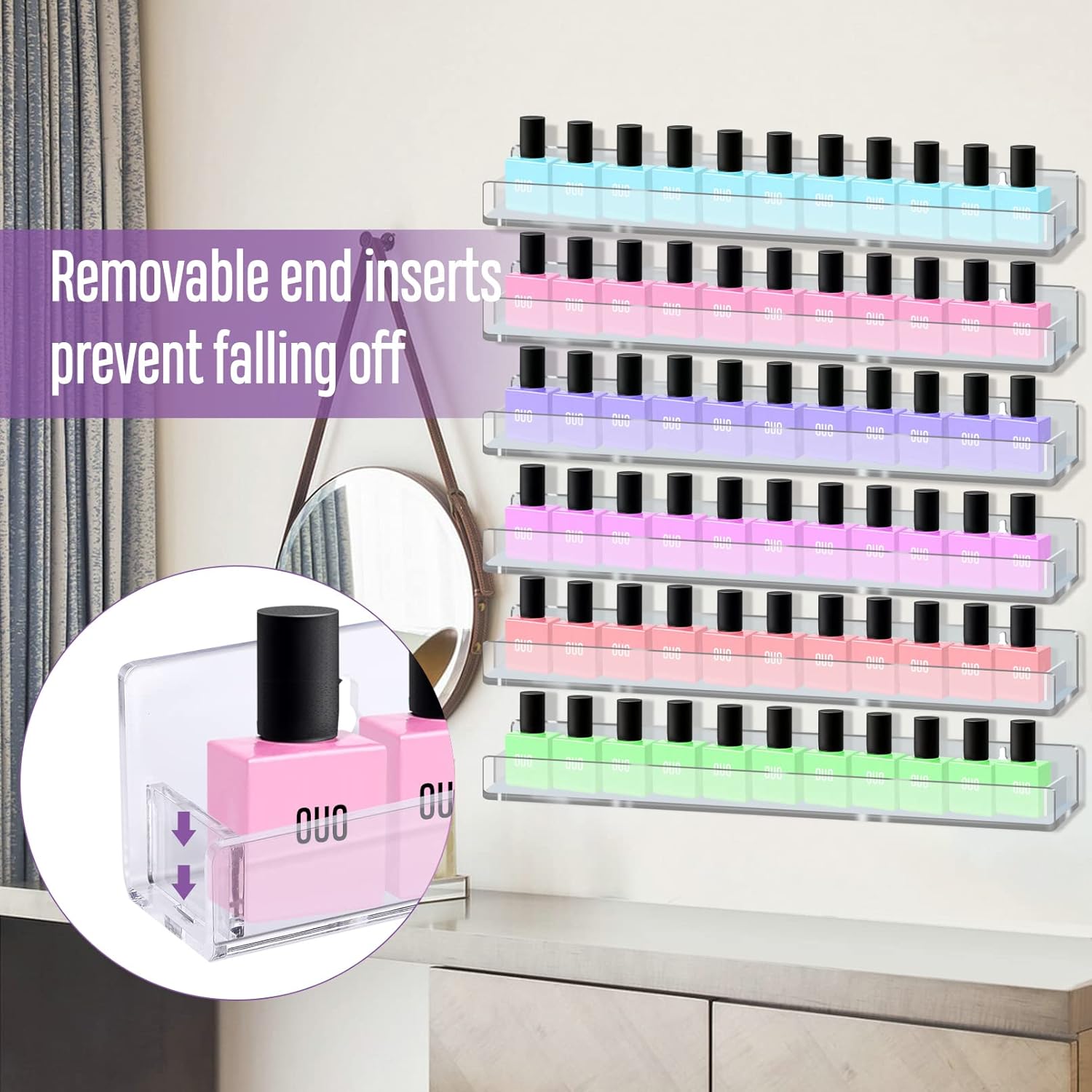 6 Pack Nail Polish Rack,Clear Acrylic Nail Polish Organizer Wall Mounted Shelf,Nail Polish Holder Organizer with Removable Anti-slip End Inserts,Clear Acrylic Shelves Nail Supplies Display 90 Bottles