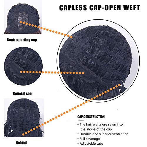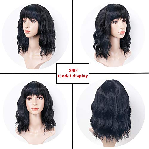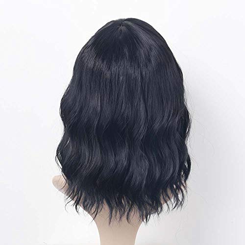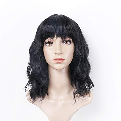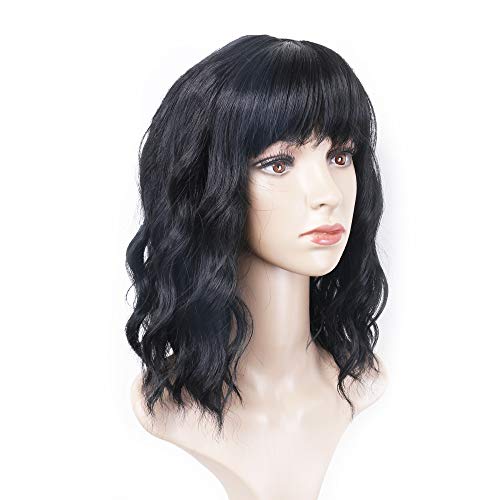 Aideshair wave wigs with bangs women’s short black wig curly wave synthetic cosplay girl colorful wig (Black)
