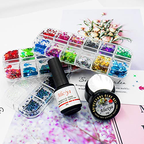 Aliciya 3D Nail Art Decoration Kits with Nail Strengthener Reinforce Gel Polish, Nail Builder Gel and 36 Styles Star & Circle Nail Gems Nail Decors Nail Flakes, Nail Rhinestone,Glitter, Nail Dryer