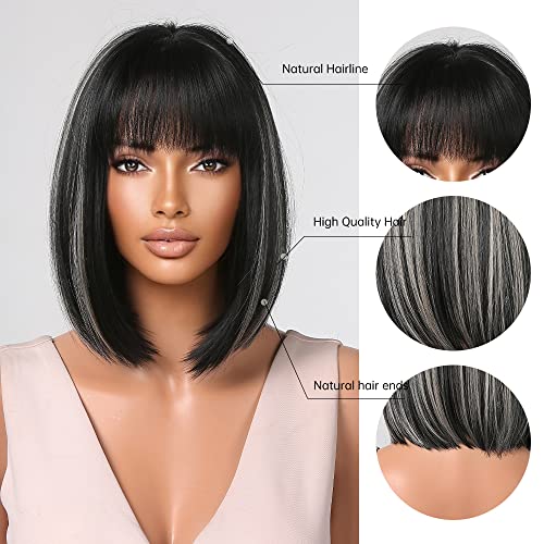 Allbell Black Bob Wigs for Women Short Bob Wigs with Bangs Black Hair with Gray Highlights Synthetic Wigs