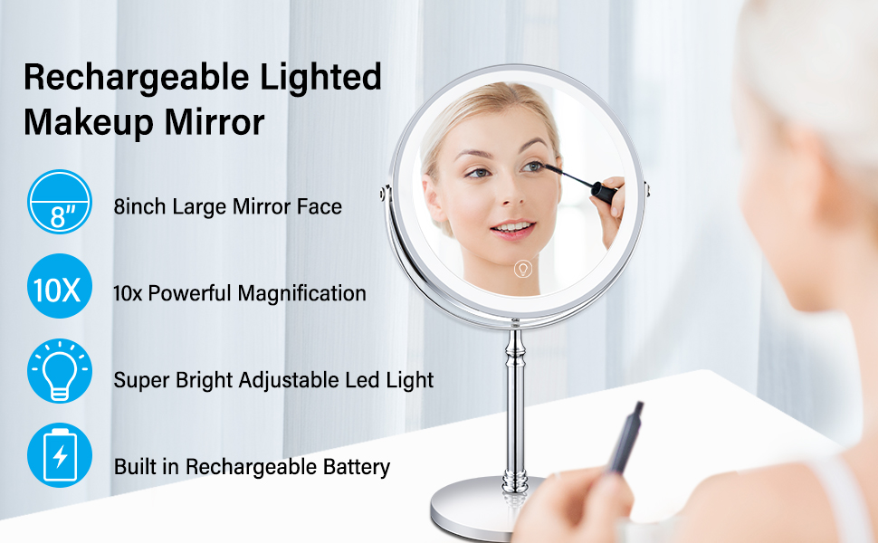 【10X Magnifying High-Definition】- Double-sided LED Makeup Mirror design (one side 1:1,other side 1:10). Both sides effect are ideal for everyone applying makeup, wearing contact lenses and eyebrow tweezing, shaving, hair styling, facial care or applying mascara.