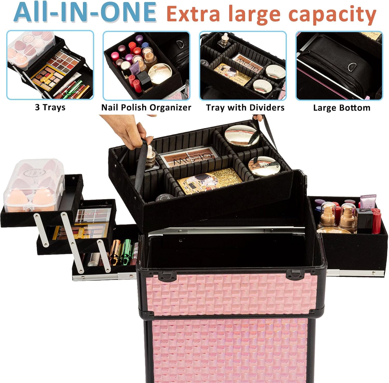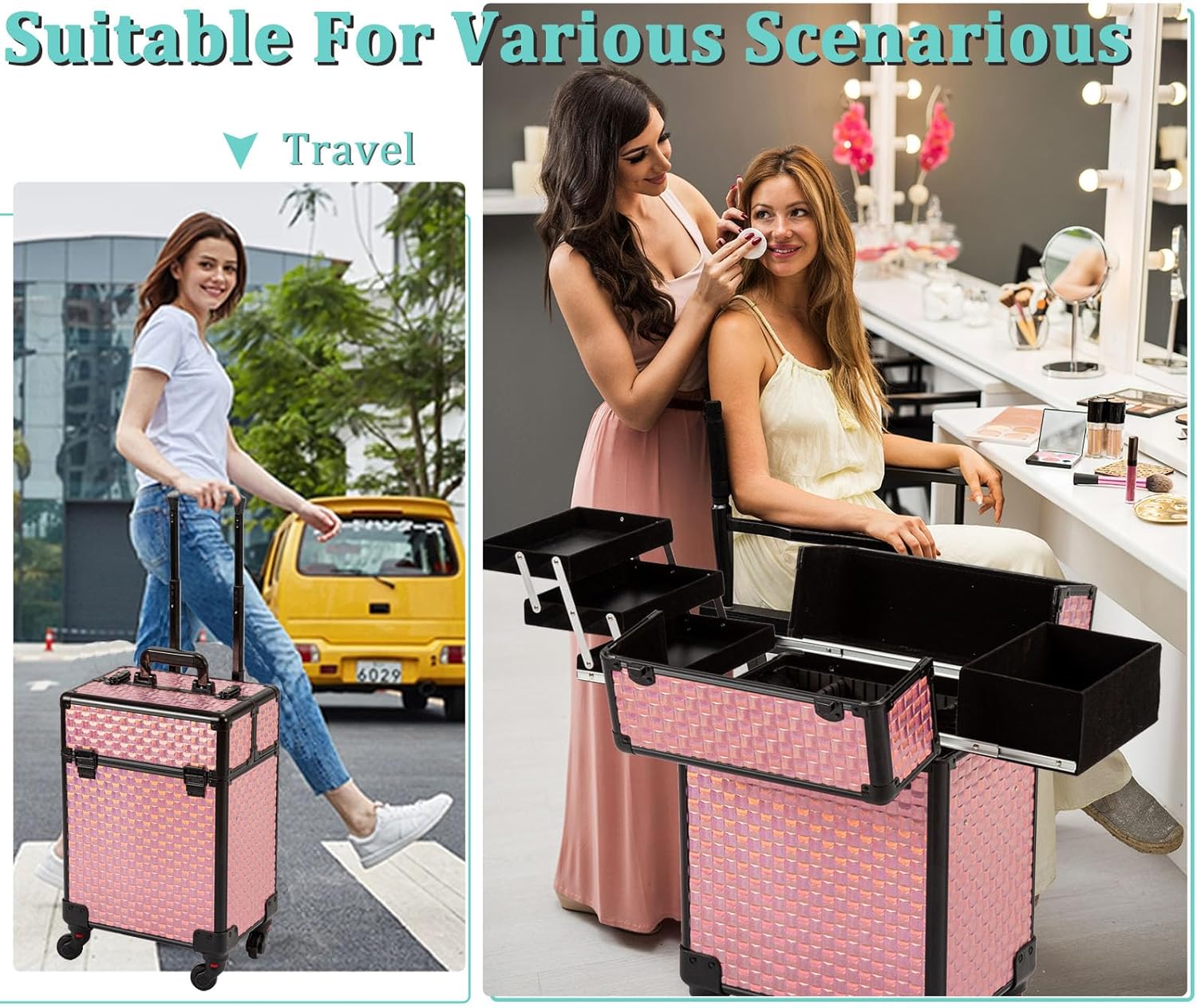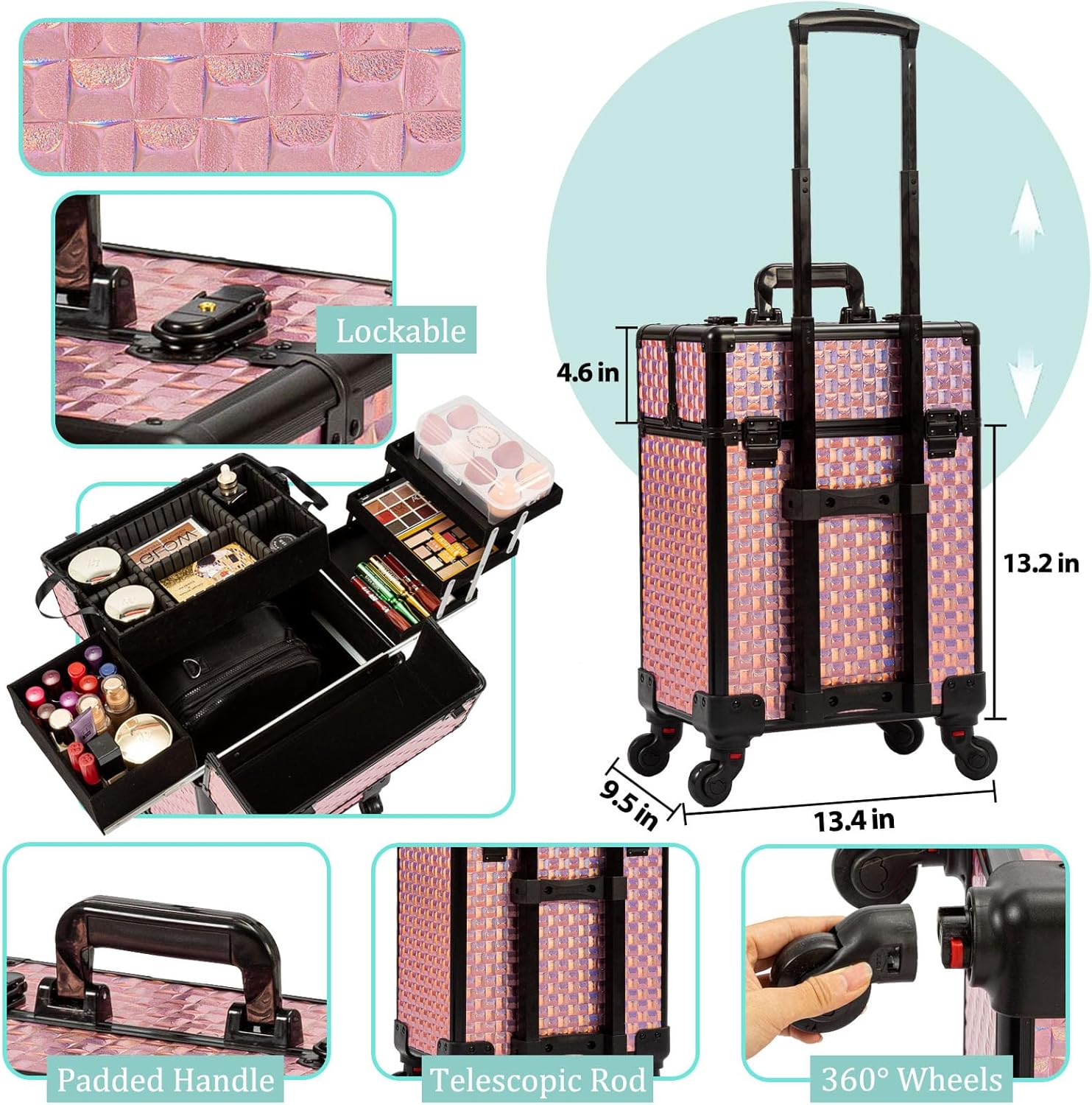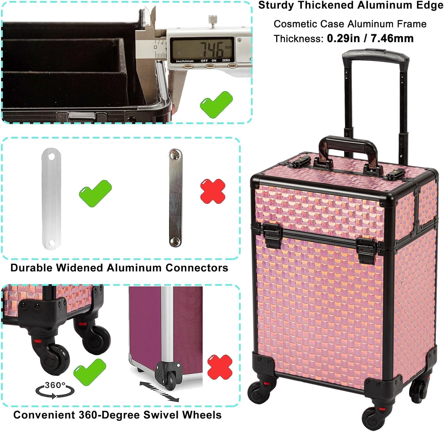 💄🎁【Sturdy Rolling Makeup Case】 Our designer carefully selected the classy black and Pink tones for this makeup case box. The small traditional pink cube pattern adds sophistication and charm, Grade-A aluminum and metal reinforced edges and corner has great performance in abrasion resistance and is characterized by its lightweight and durability. It can change with color shades when it catches light at different angles.