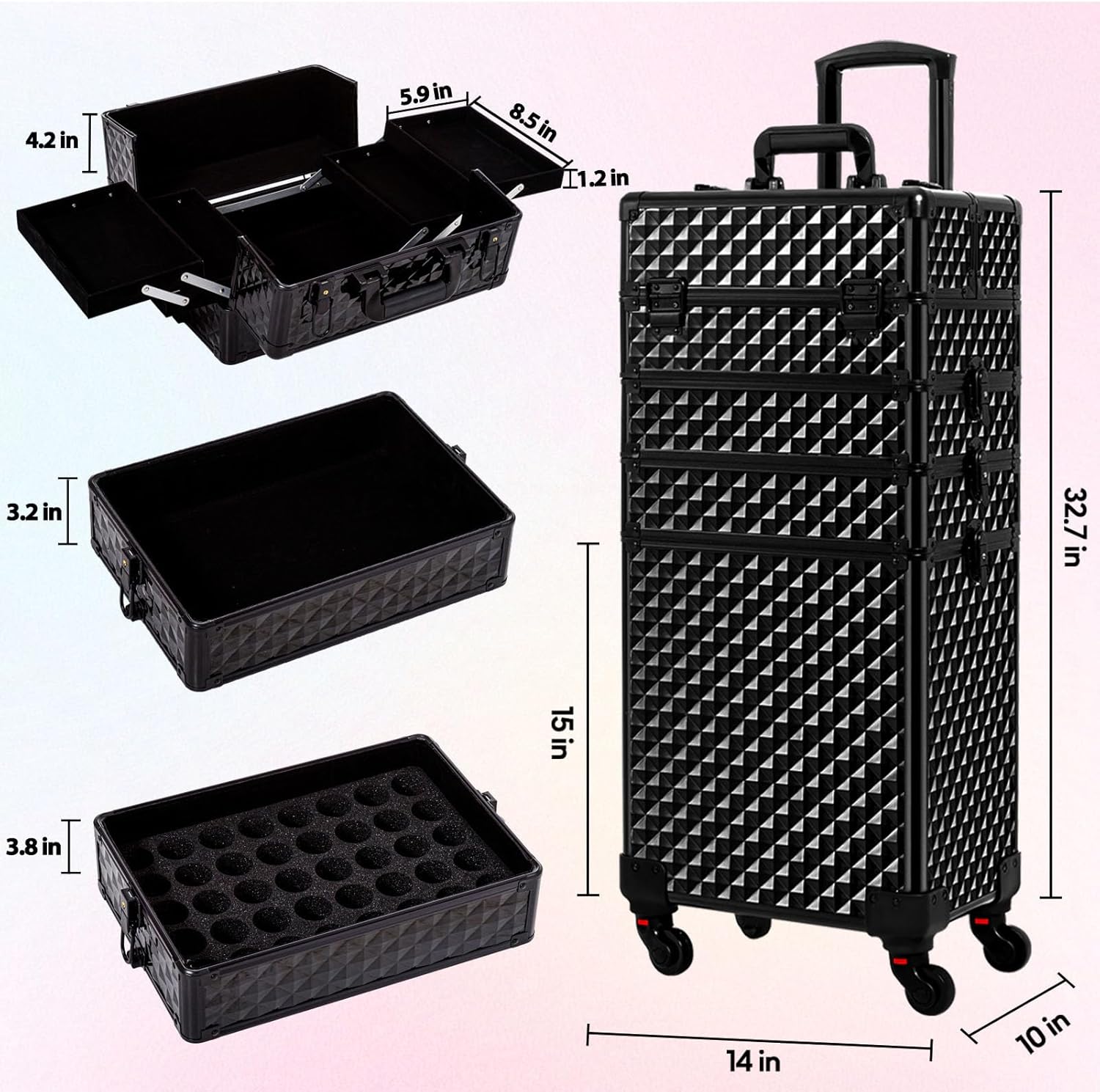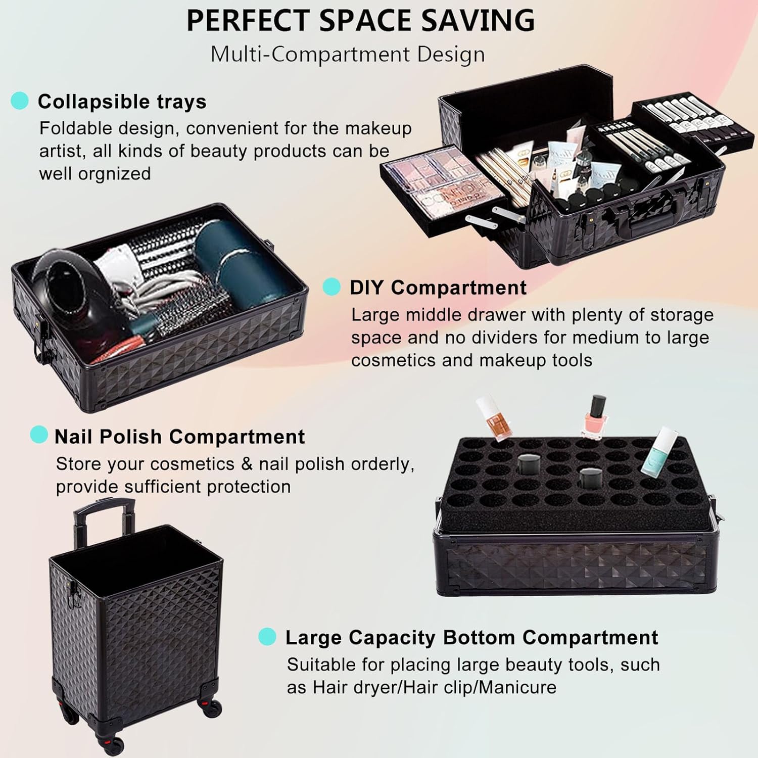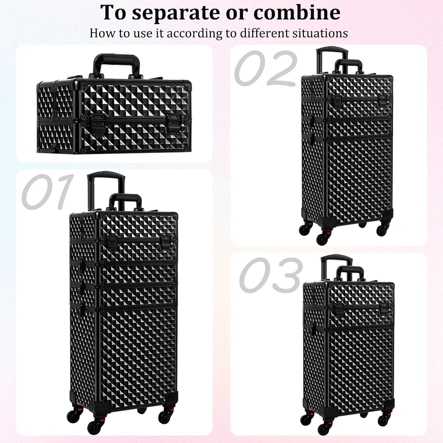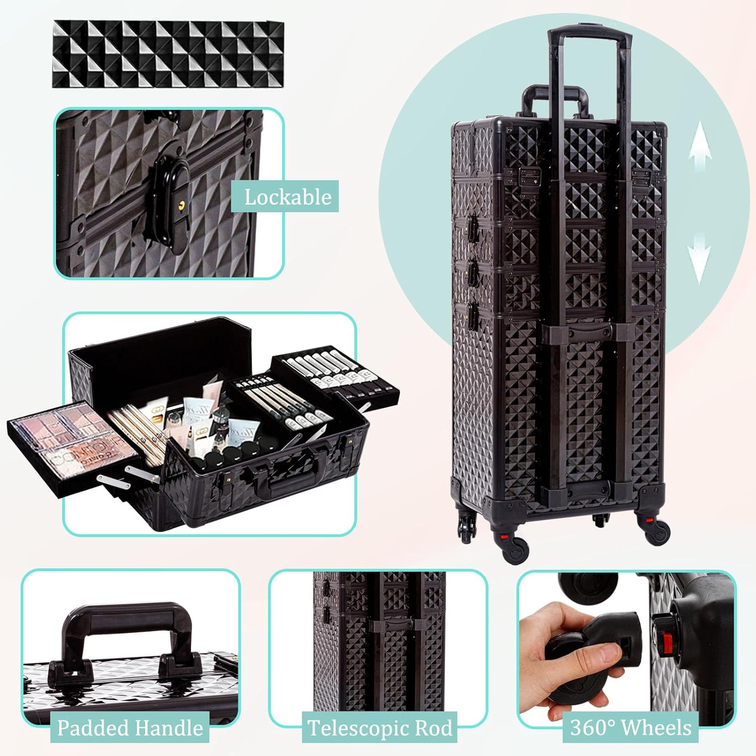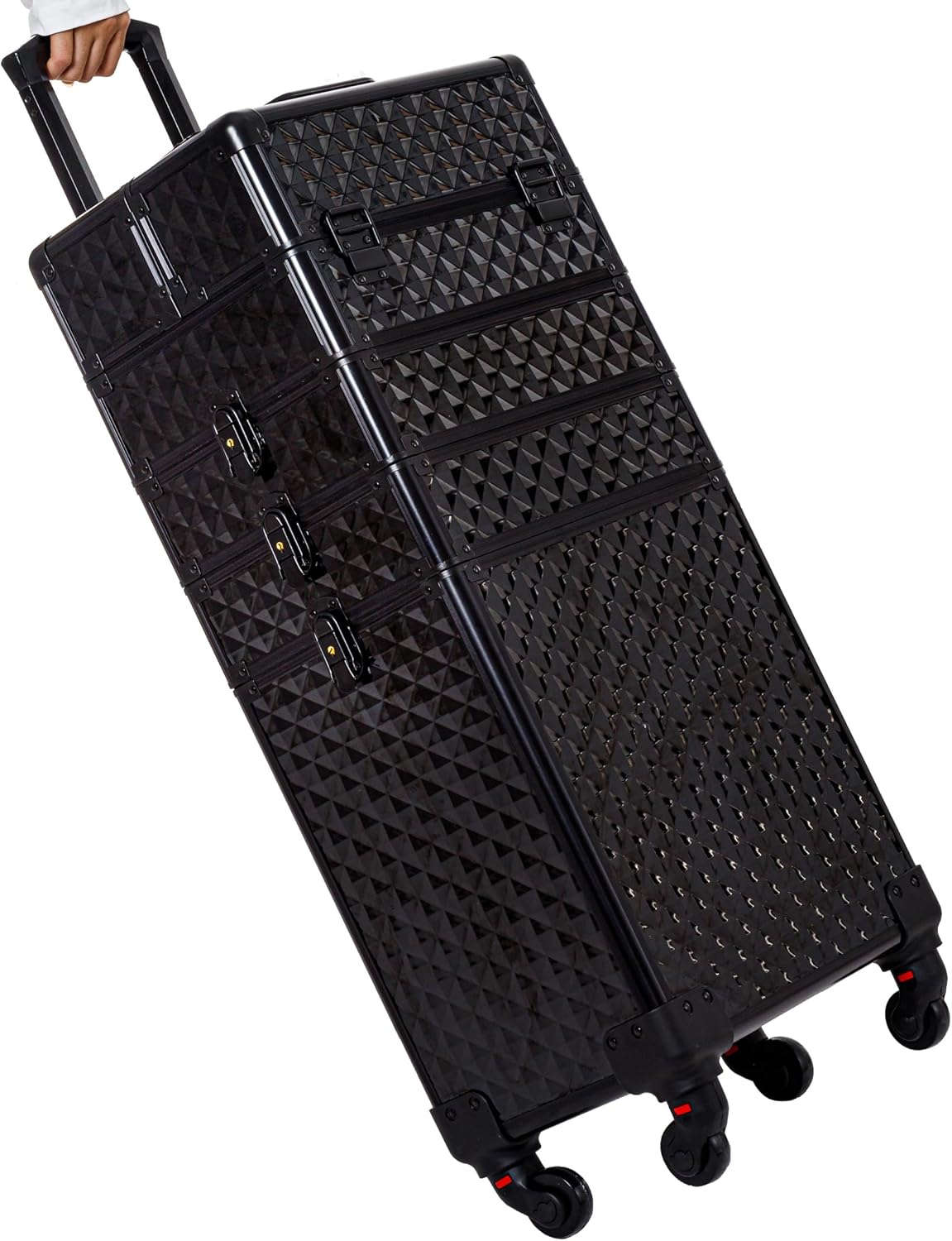 AROUS Rolling Makeup Train Case Large Storage Cosmetic Trolley 4 in 1 Large Capacity Trolley Makeup Travel Case with Key Swivel Wheels Salon Barber Case Traveling Cart Trunk, Black