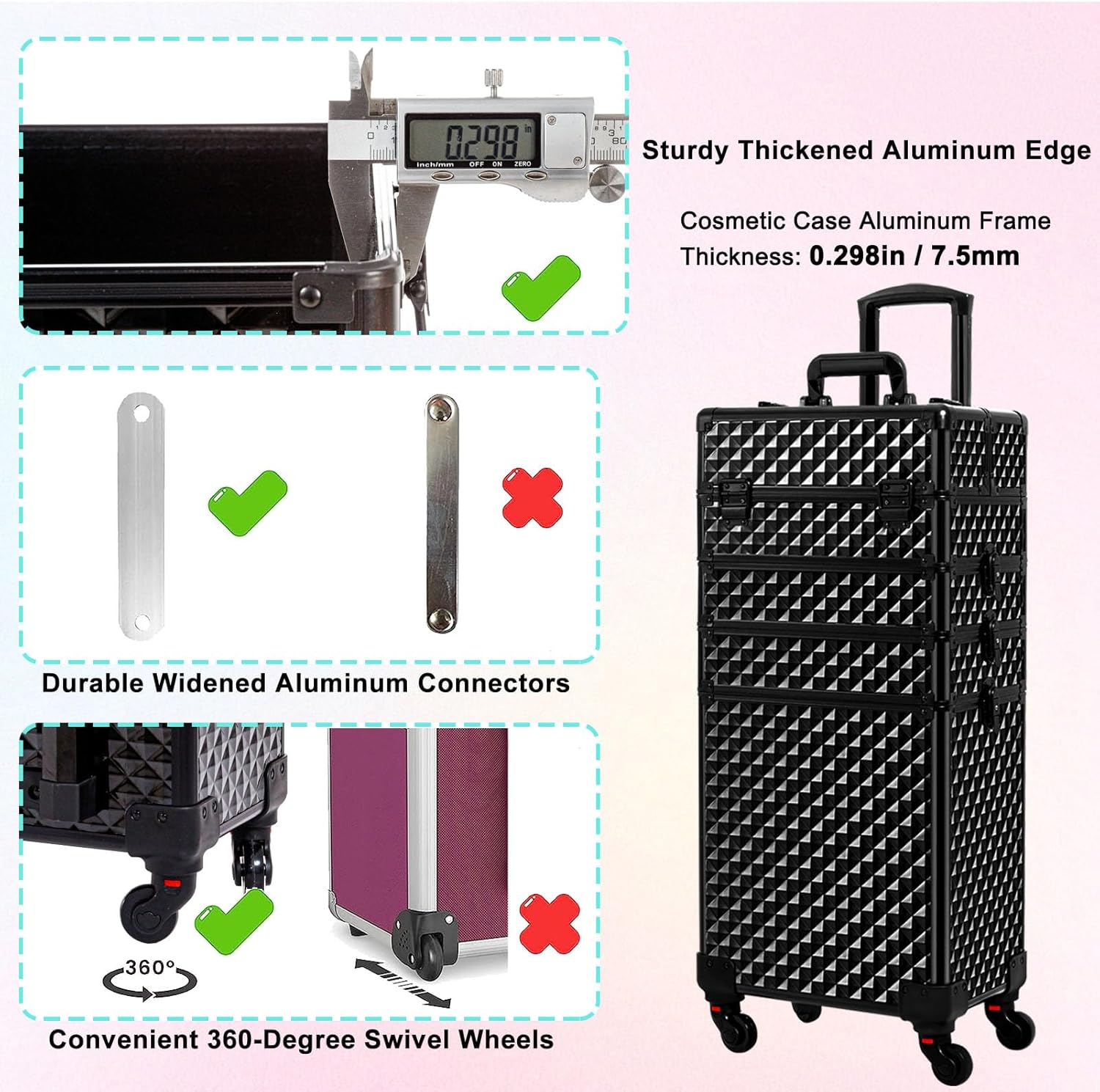 💄🎁【Black Diamond Trolley】: The main body of this makeup case is made of ABS and high-density MDF material, while the edge frame and corners are made of reinforced aluminum, both of which ensure a long service life; High-quality full velvet lining reduces friction and protects delicate cosmetics, all while delivering a pleasant feeling with soft tactile. Aluminum tie rods provide smooth operation and corrosion resistance.