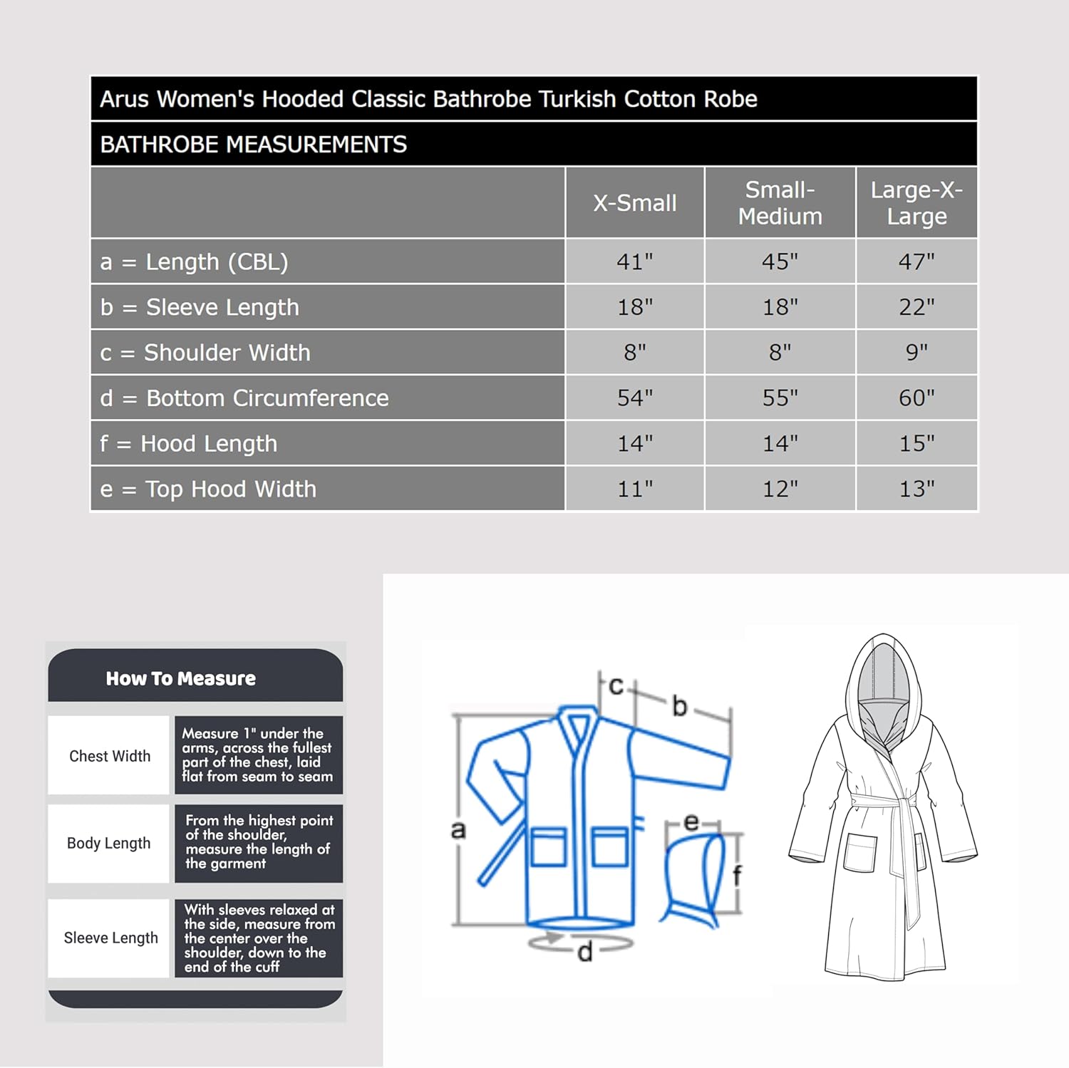 100% Turkish Terry CottonMade in TurkeyMachine Wash with like Colors Tumble Dry Low HeatHooded bathrobe with 2 patch pockets and double belt loops for comfortAvailable in Size XS , S-M and L-XL. Simply select your size from the size drop down listFor men’s hooded bathrobes, search Amazon for “Arus men’s hooded bathrobes”