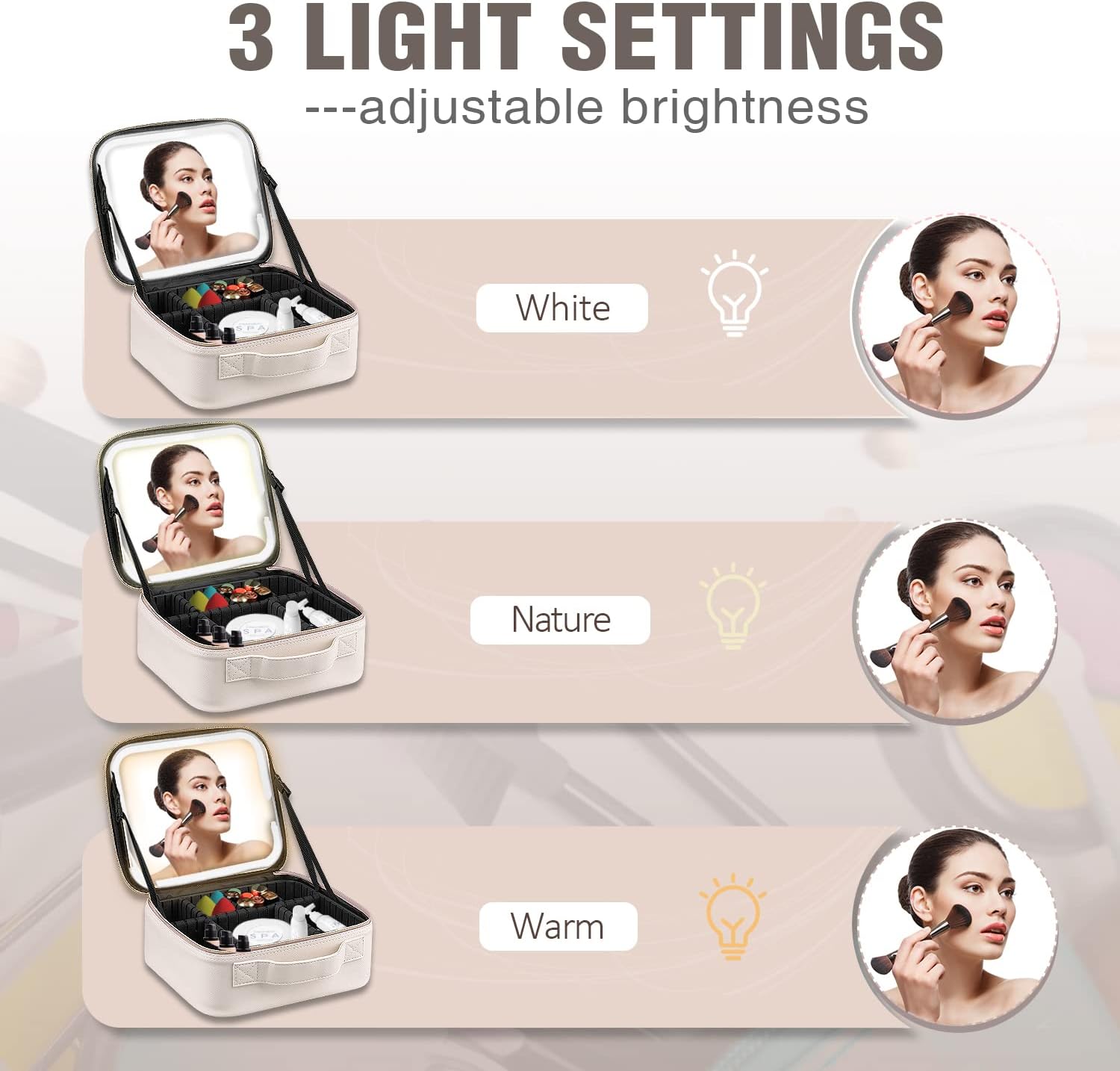 AZ GOGO Travel Makeup Bag with Light up Mirror, Makeup Train Case with Lighted Mirror 3 Color Brightness, Waterproof Portable Cosmetic Bag Organizer (Creamy White)