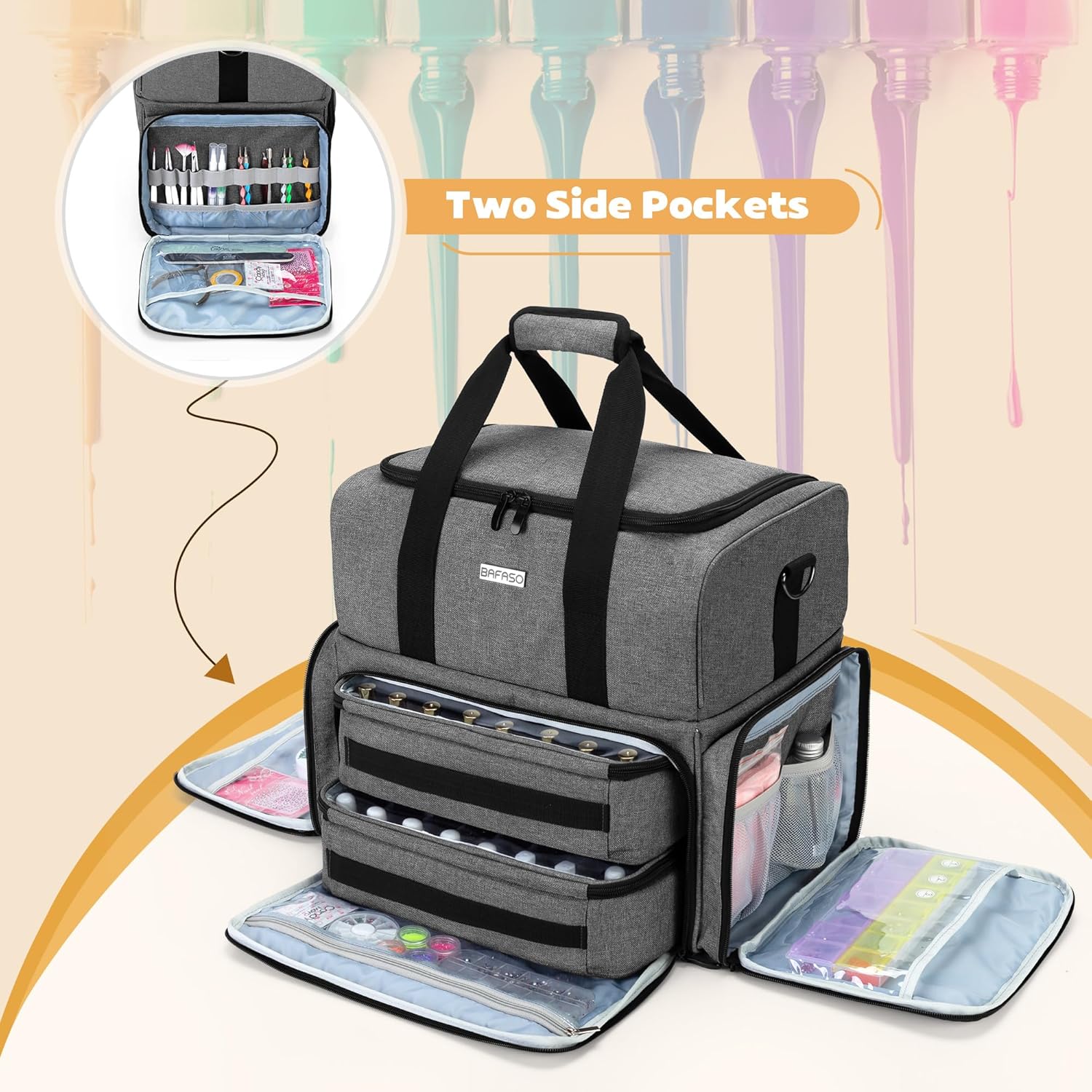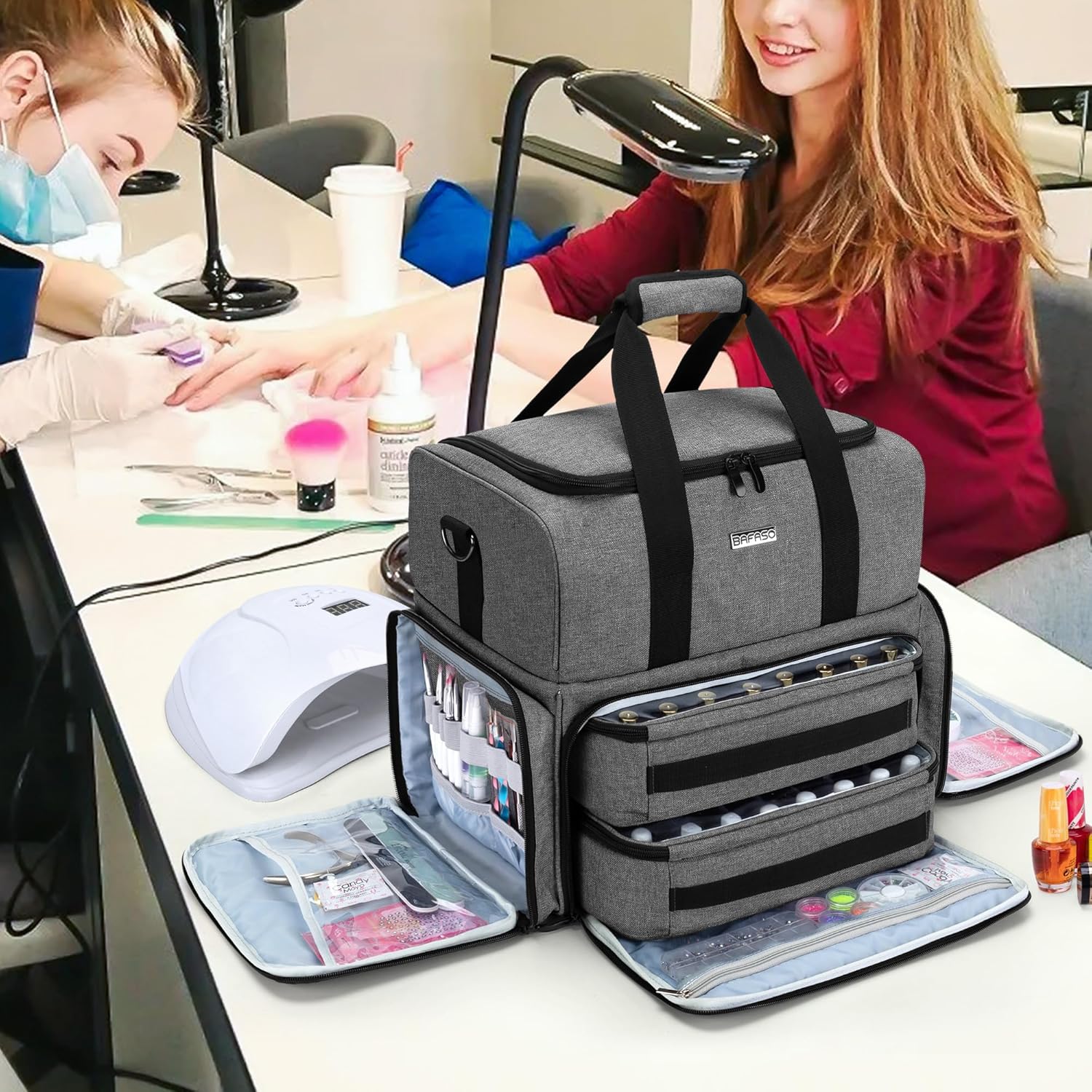 BAFASO Nail Polish Organizer Holds 80 Bottles (15ml – 0.5 fl.oz) and a UV Nail Lamp, Nail Polish Case with 2 Removable Pouches and Manicure Tools Storage Sections (Patented), Gray