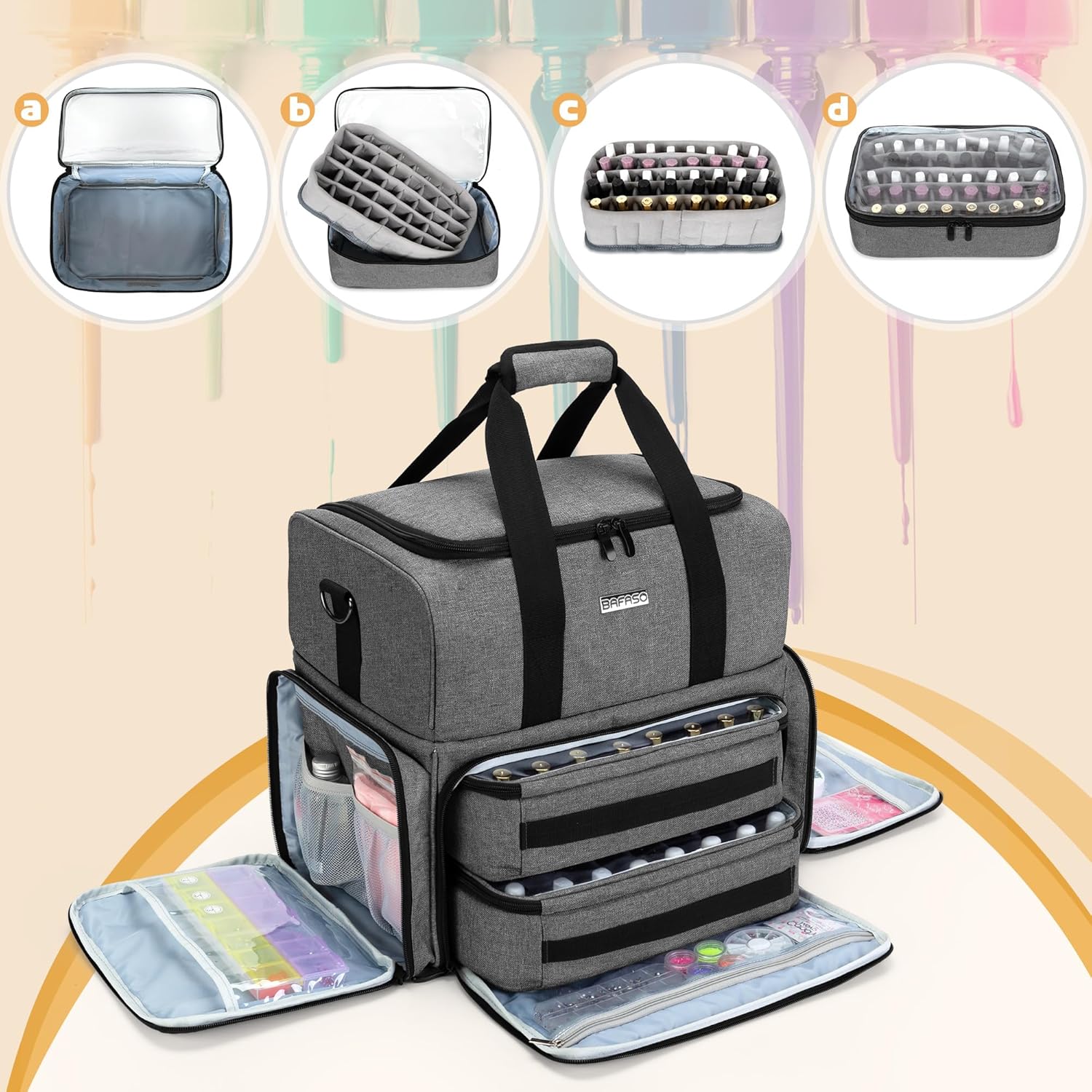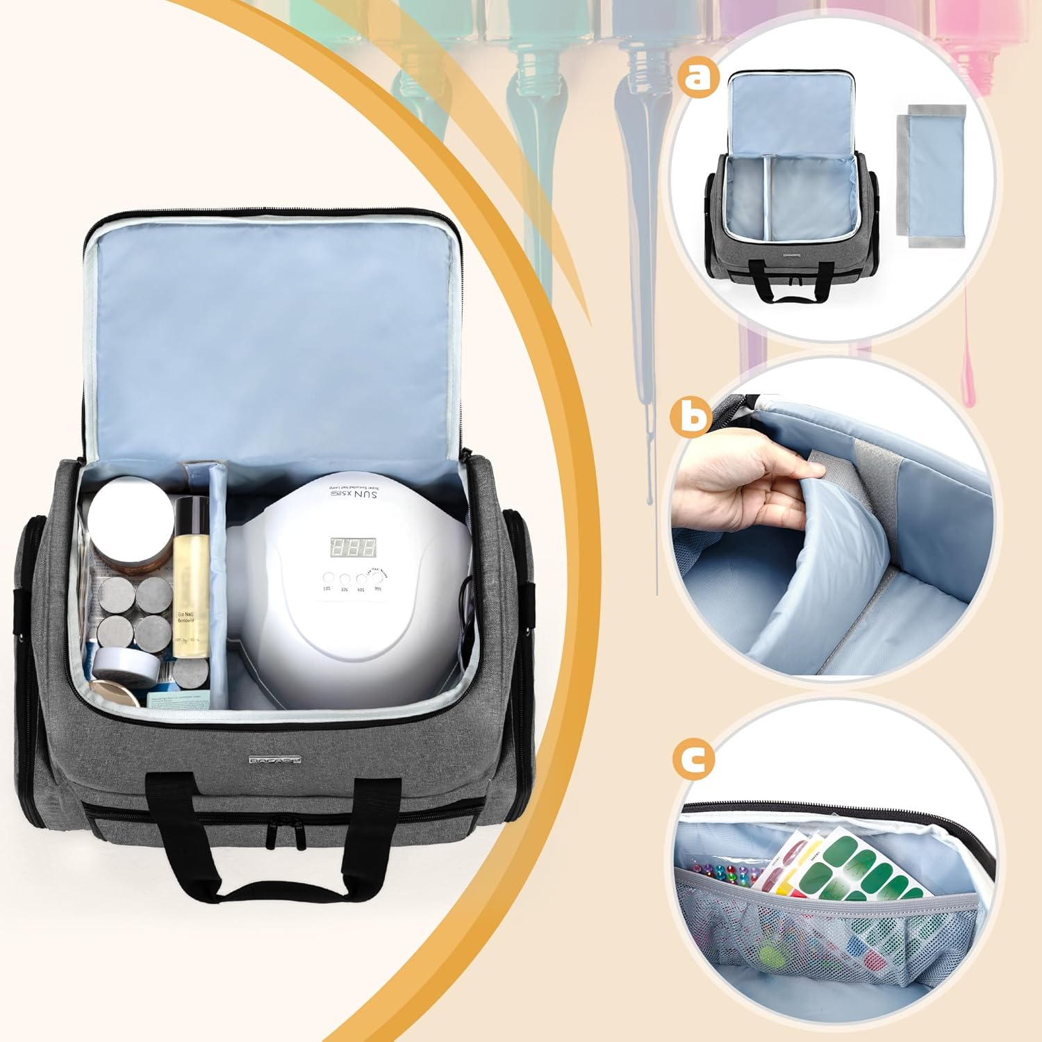 MAIN STORAGE SPACE – The lower section contains 2 removable nail polish bags to store 80 nail polish bottles (15ml/0.5 fl.oz) in total. (Notes: The divider insert is resizable & detachable)