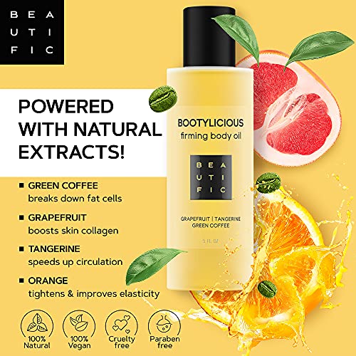 BEAUTIFIC Natural Firming Body Oil | Bootylicious | Skin Tightening Anti Cellulite Oil | Body Oil Moisturizer With Grapefruit Essential Oil & Tangerine and Green Coffee Oil 5 fl.oz