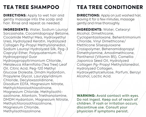 Tea Tree Shampoo: Water, Sodium Lauroyl Sarcosinate, Cocamidopropyl Betaine, Cocamide Methyl Mea, Hydroxyethyl Urea, Hydrolyzed Keratin, Hydrolyzed Collagen Pg-propyl Methylsilanediol, Sodium Lauroyl, Hydrolyzed Silk, Ppg-3 Caprylyl Ether, Polyquaternium-10, Hydroxypropyl Guar, Hydroxypropyltrimonium Chloride, Melaleuca Alternifolia (Tea Tree) Leaf Oil, Citric Acid, Peg-120 Methyl Glucose Dioleate, Dmdm Hydantoin, Propylene Glycol, Laurylpyridinium Chloride, Decyloxazolidinone, Disodium Edta, Magnesium Nitrate, Methylchloroisothiazolinone, Magnesium Chloride, Methylisothiazolinone, Allantoin, Triethanolamine. Tea Tree Conditioner: Water, Cetearyl Alcohol, Dimethicone, Cyclopentasiloxane, Behentrimonium Chloride, Vinyl Dimethicone/methicone Silsesquioxane Crosspolymer, Behenamidopropyl Dimethylamine, Amodimethicone, Panthenol (Vitamin B5), Camellia Japonica Seed Oil, Hydrolyzed Collagen Pg-propyl Methylsilanediol, Hydrolyzed Collagen, Hydroxyethylcellulose, Parfum, Benzyl Alcohol, Lactic Acid.