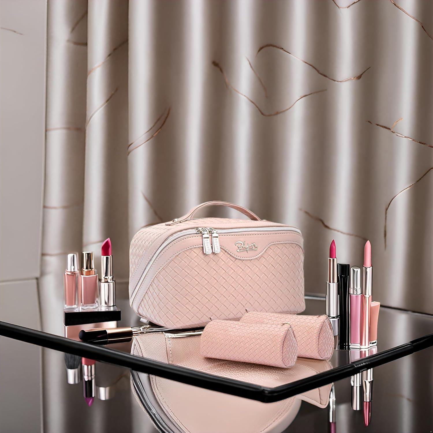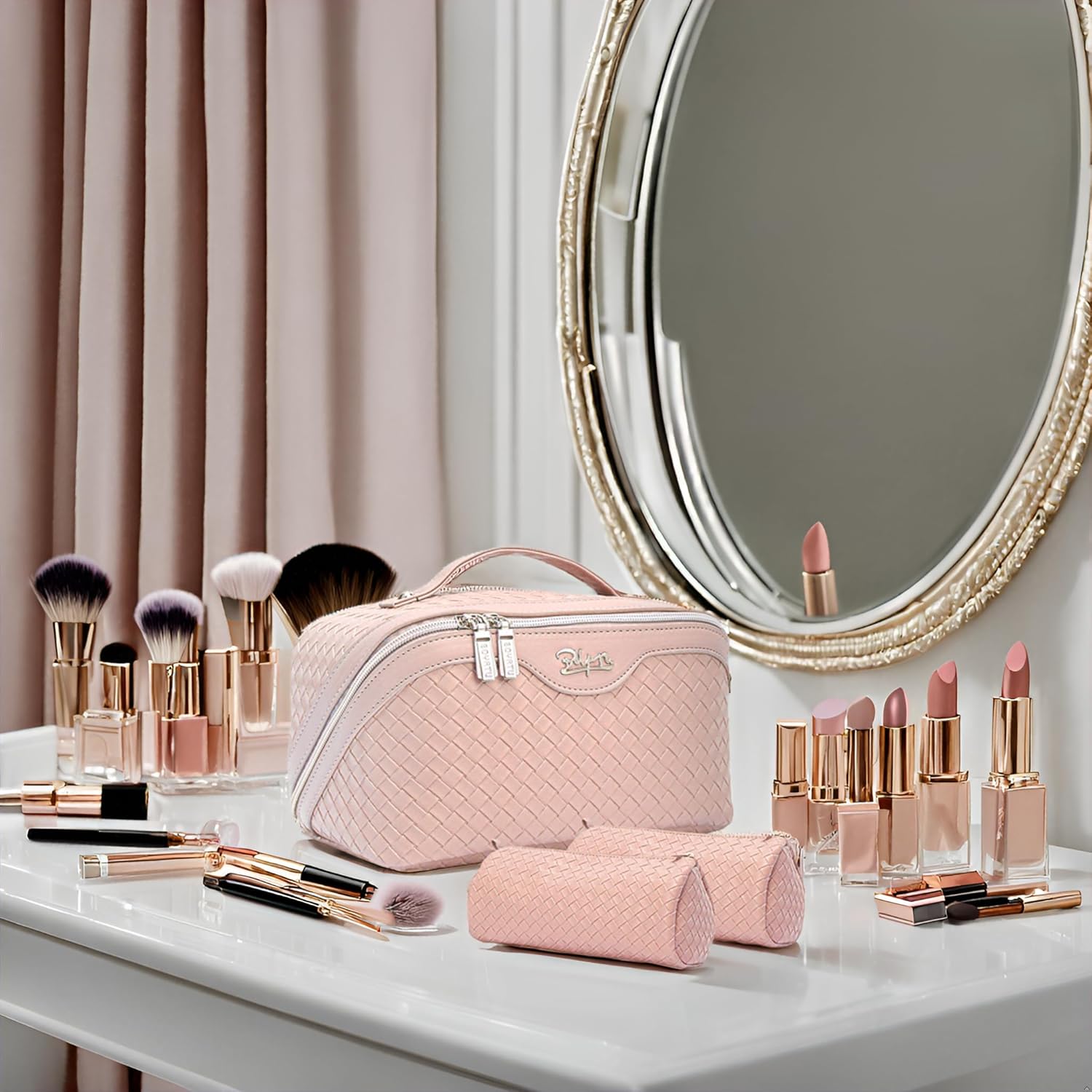 BOYATU Travel Makeup Bags for Women: Large Cosmetic Bag Waterproof – Vegan Leather Make up Bag Set of 3 – Compact Toiletry Organizer with Compartments & Handle & Divider (L01 Light Pink)
