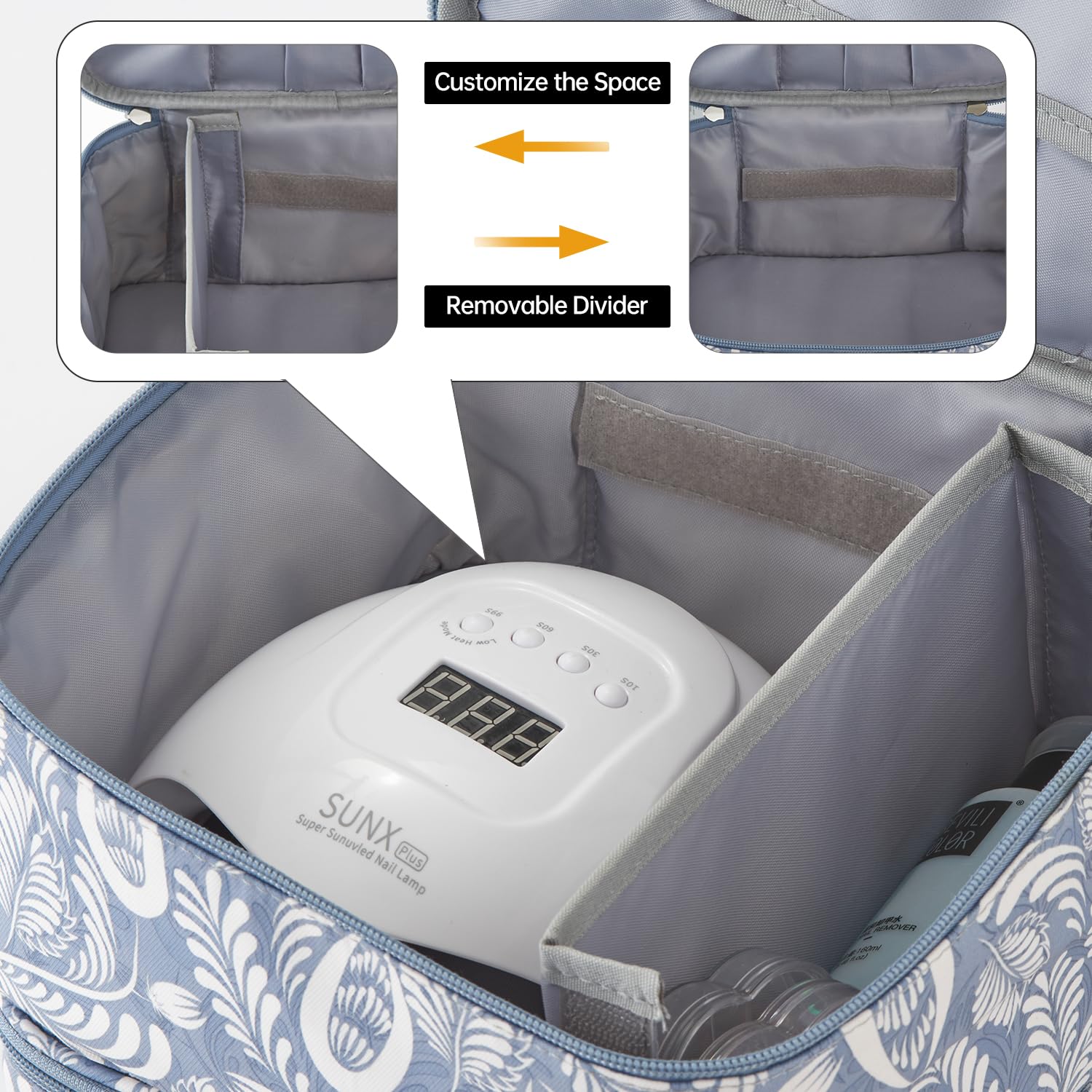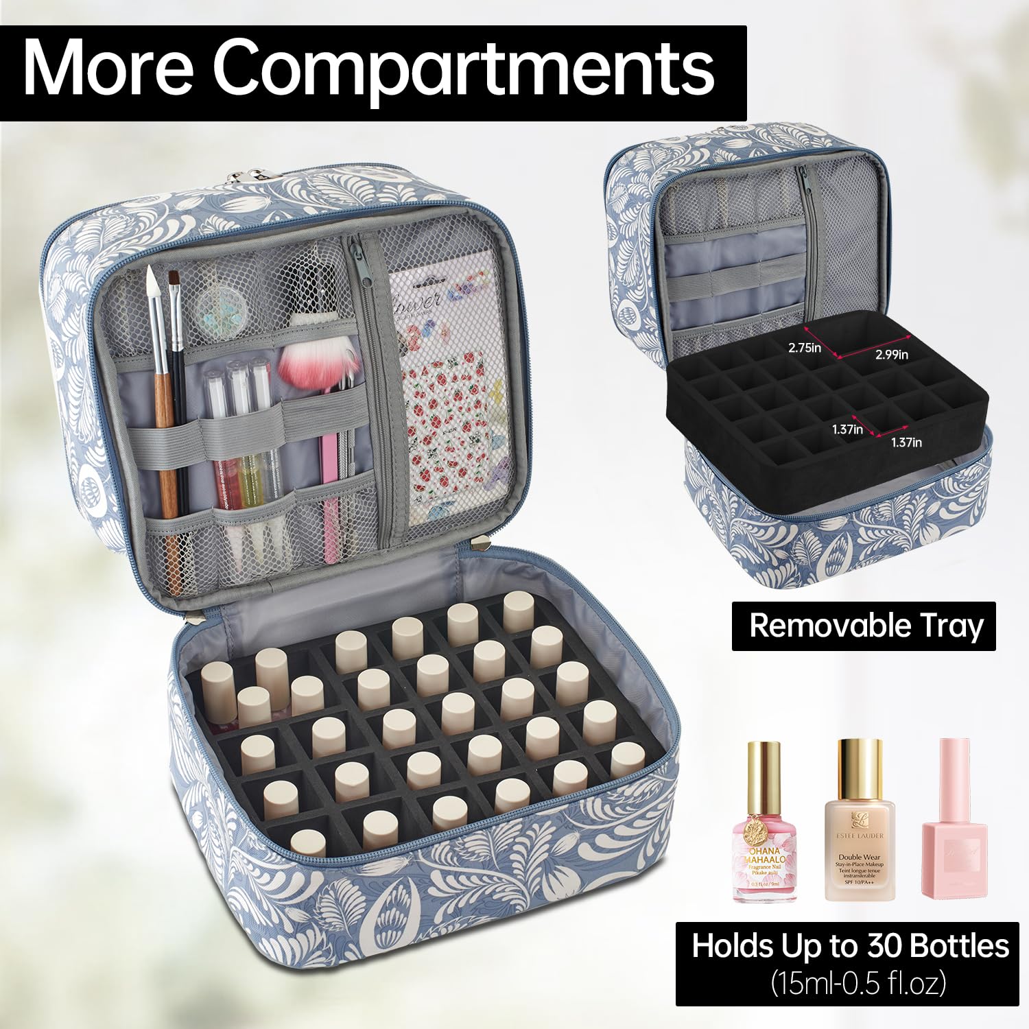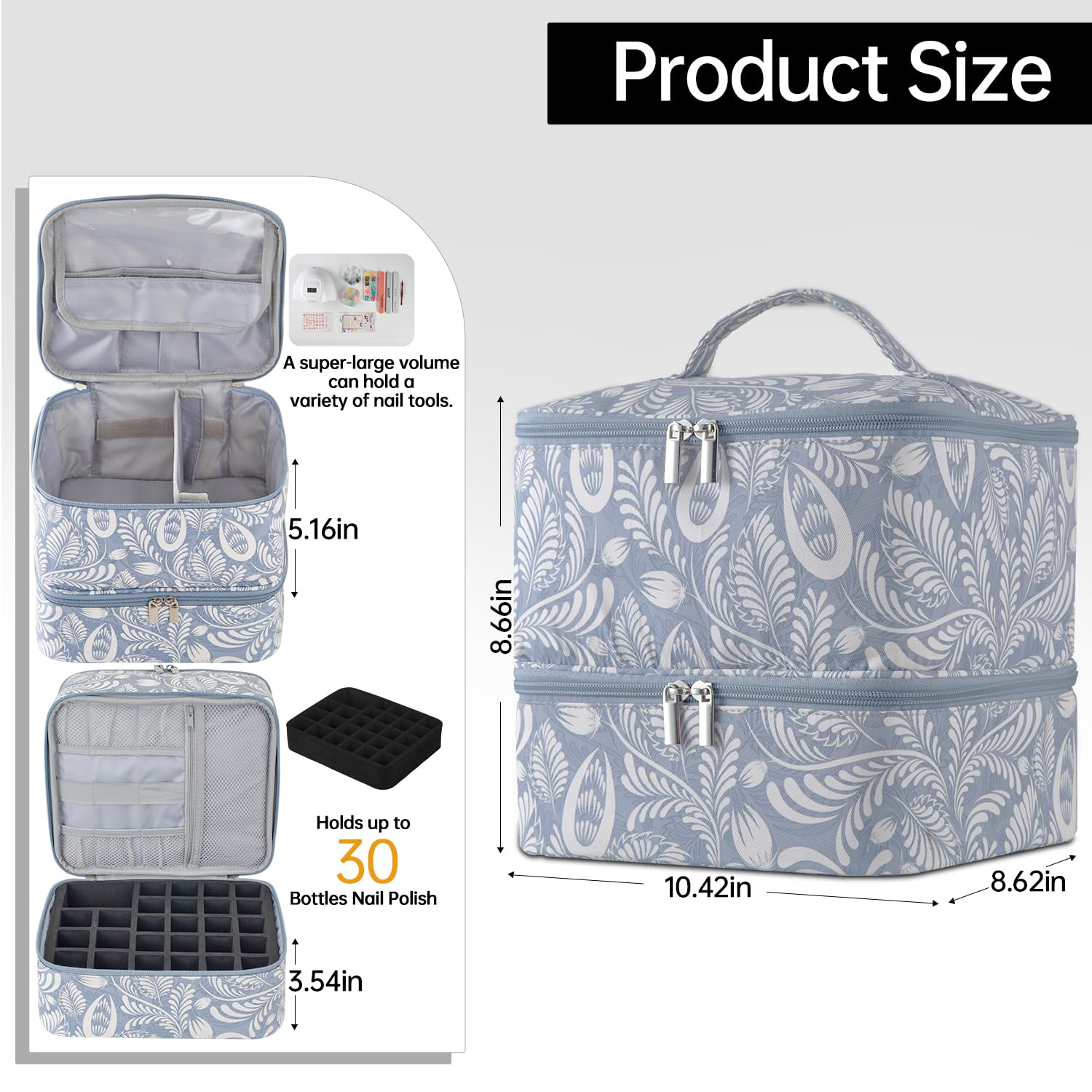 Buruis Nail Polish Organizer, Double-Layer Nail Tools Nail Dryer Case, Holds 27 Various Size Bottles (15ml – 0.5 fl.oz or Larger), Nail Polish Carrying Case with Adjustable Dividers(Light Blue Leaf)
