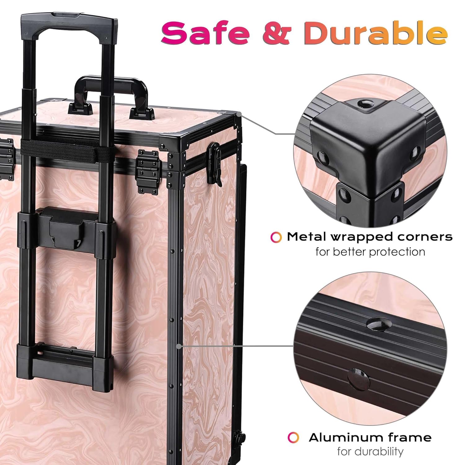 – Sturdy & Safe – Features a sturdy aluminum frame and metal wrapped corners for strong support and impact protection, along with lockable latches with keys on the lid and password access on the door offering exceptional security for your cosmetics
