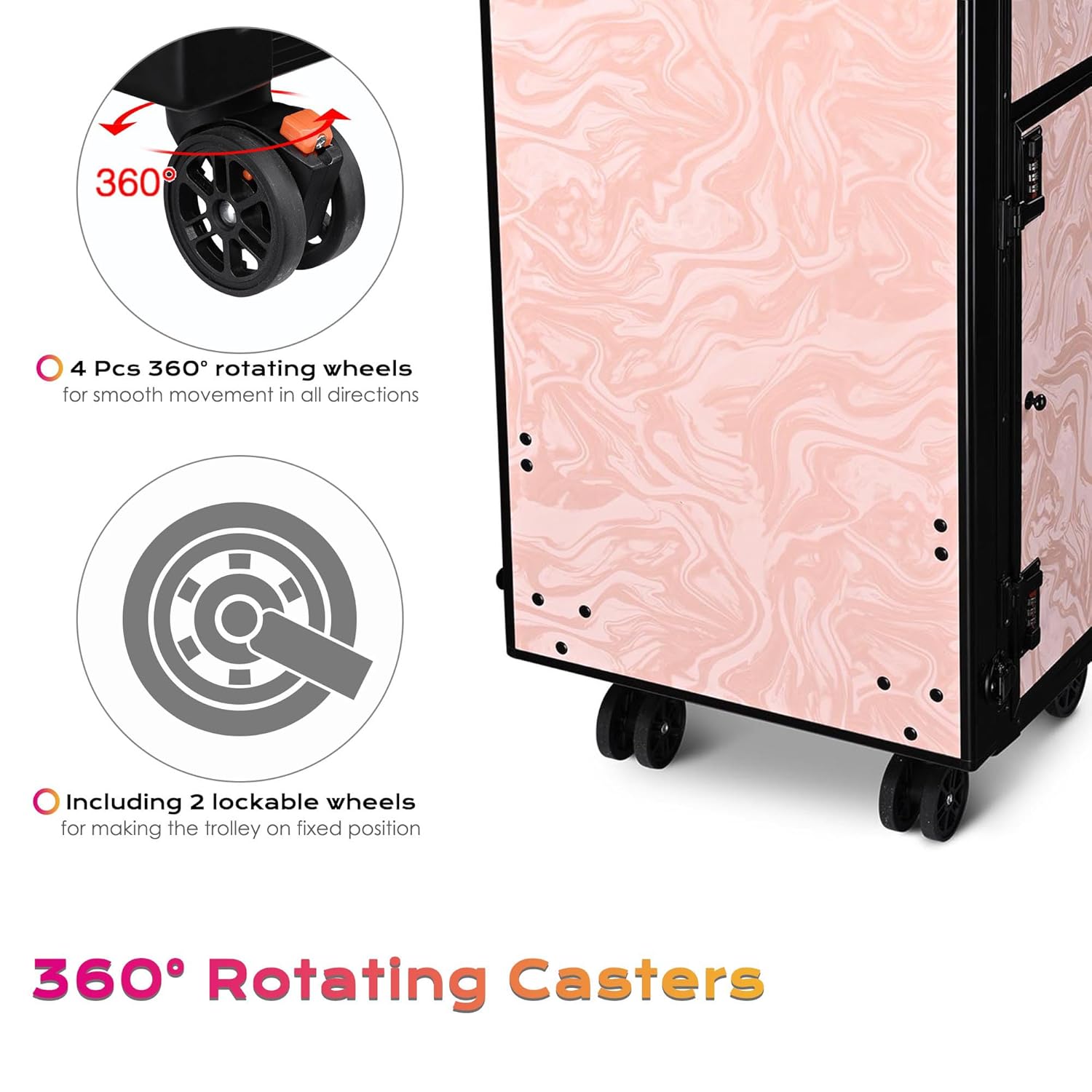 – Mobile Makeup Studio – Features an expandable floor-standing table for dual purposes, serving as either a trolley case or a nail art workstation, along with foldable design allowing it to be folded into a one-piece trolley case with 360-degree swivel and detachable wheels for easy movement and replacement