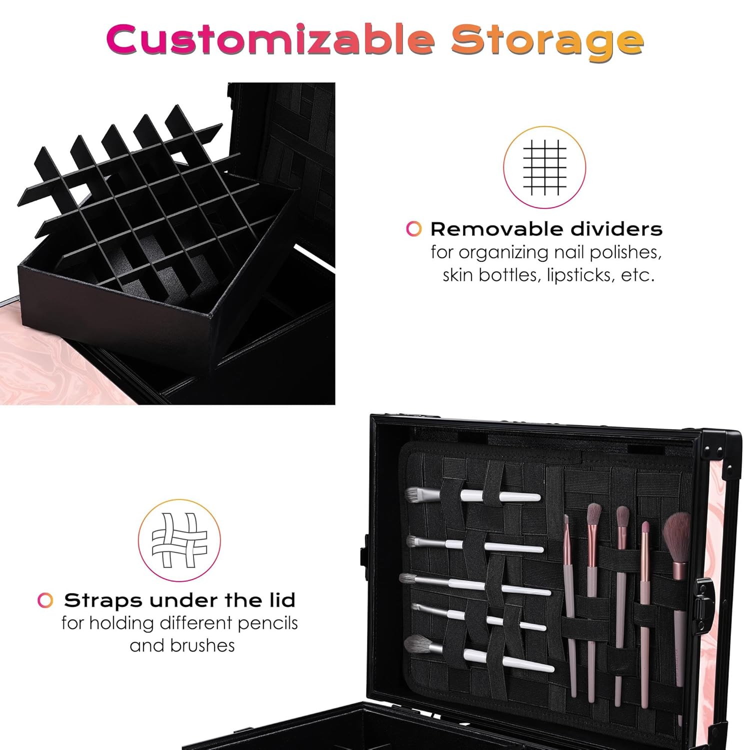 Sturdy & Safe – Features a sturdy aluminum frame and metal wrapped corners for strong support and impact protection, along with lockable latches with keys on the lid and password access on the door offering exceptional security for your cosmetics