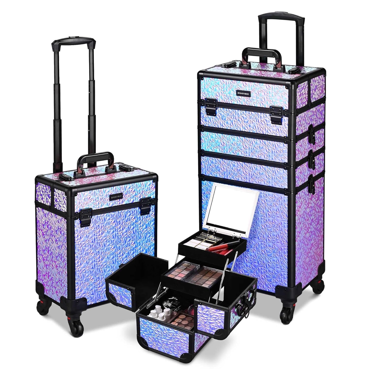 3-Piece Makeup Case Set – Byootique Kit includes 1 pcs 4-in-1 rolling makeup case, 1 pcs middle-sized trolley, and 1 pcs handheld train case, featuring iridescent purple diamond pattern, inspired by the mythical mermaid and sunset sky, a complete set to meet various demands for cosmetics storage while inspiring you to explore full potential of beauty