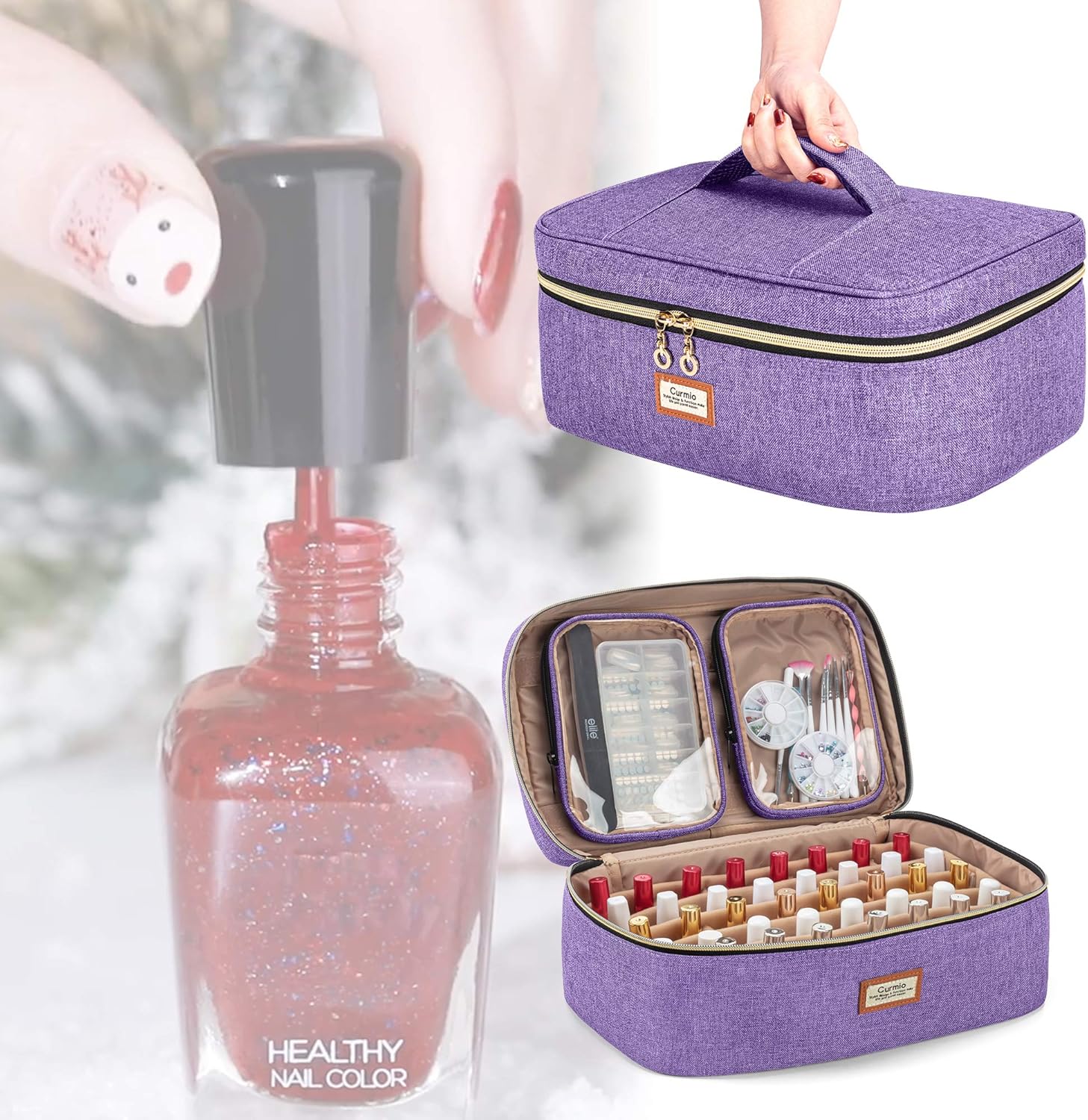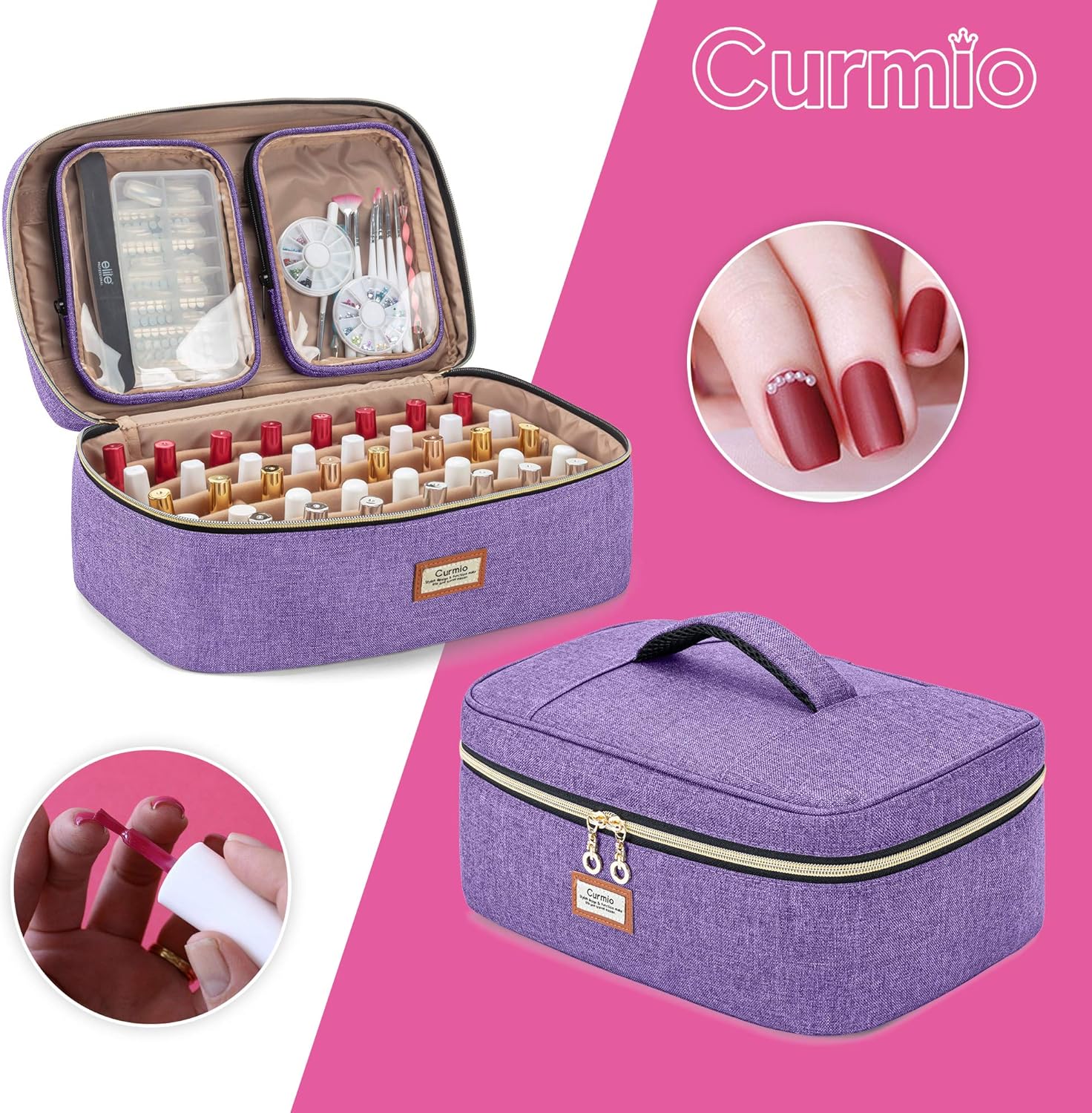 CURMIO Nail Polish Carrying Case Holds 40 Bottles (15ml/0.5 fl.oz), Nail Polish Travel Storage Bag with 2 Detachable Transparent Pouches and Portable Handle, Patented Design, Bag Only