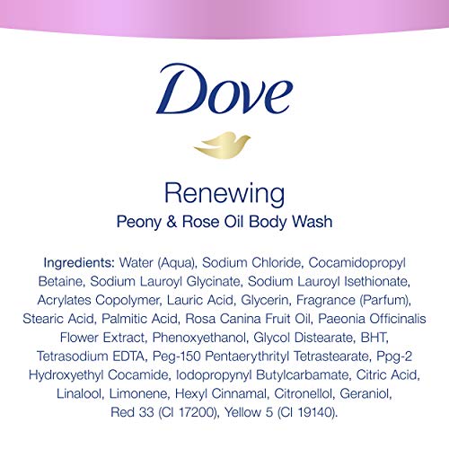 Looking for a body wash that delights your senses and helps to renew skin? The number1 dermatologist recommended body wash, Dove Renewing Body Wash nourishes your skin with peony and rose oil extracts while leaving skin soft and dewy. This Peony and Rose Oil body wash is sulfate-free and paraben-free with a mild, pH-balanced formula, making it a great body wash for dry skin unlike typical bath soap or shower soap. This body wash uses Dove Moisture Renew Blend, a combination of skin-natural nourishers and plant-based moisturizers. The lipids and glycerin in our formula absorb deeply into the top layers of skin, where they get right to work This proprietary blend of moisturizing ingredients is proven to work with your skin to nourish it, so it can maintain and create new moisture. For best results, squeeze this rose oil and peony body wash into your hand or onto a shower pouf and work it into a rich lather. Massage it over your skin, taking time to allow the energizing peony and rose oil extracts to waken your senses. Rinse off, revealing soft and dewy skin. Made with 100 per cent gentle cleansers, Dove Renewing Body Wash is gentle to skin’s microbiome, its living protective layer. It creates a rich lather that moisturizes and replenishes skin while also leaving it cleansed, revived, and soft. With naturally derived cleansers and skin-natural nutrients, we care about what goes into our body wash. Dove sulfate-free body wash is number1 dermatologist recommended and microbiome gentle. Dove care goes further than moisturizing body wash with PETA Cruelty-Free certification and 100 per cent recycled plastic bottles. At Dove, our vision is of a world where beauty is a source of confidence, and not anxiety. So, we are on a mission to help the next generation of women develop a positive relationship with the way they look-reaching over 1/4 of a billion young people with self-esteem education by 2030. We are committed to a landmark new initiative as part of our 2025 commitment to reduce plastic waste-reducing over 20,500 metric tons of virgin plastic annually by making the iconic beauty bar packaging plastic-free globally, launching new 100 per cent recycled plastic bottles and trialing a new refillable deodorant format that radically reduces plastic use. As one of the largest beauty brands in the world, we are revealing an agenda-setting commitment to tackle the global beauty industry’s plastic waste issue.