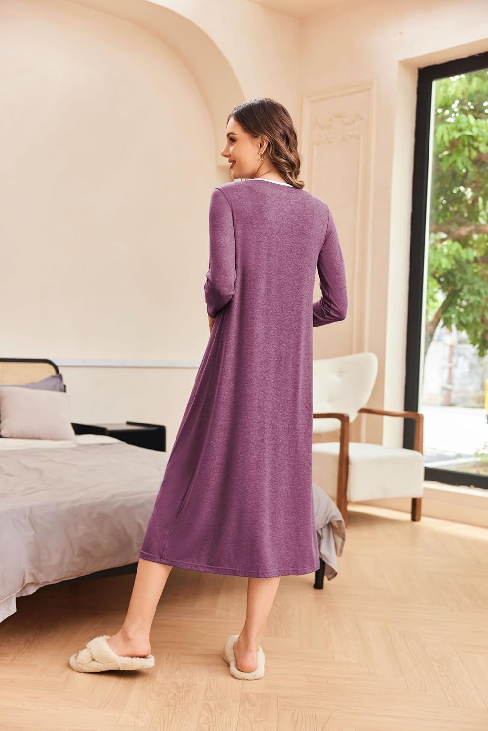 Ekouaer nightgown featuring casual long loungewear design, sexy O neck nightshirt, long sleeve sleepwear and long lounger dress.So different unique and comfort pajama dressFull-length nightgown sleep dress is warm, comfortable and cozy.This Ekouaer nightshirt is great for your girlfriend,wife,mother and sister as a birthday gift ,perfect for lounging & shopping&matches with your daily leisure&relaxing around the house on weekends,do some reading or listen to some music with a cup of coffee in daily life