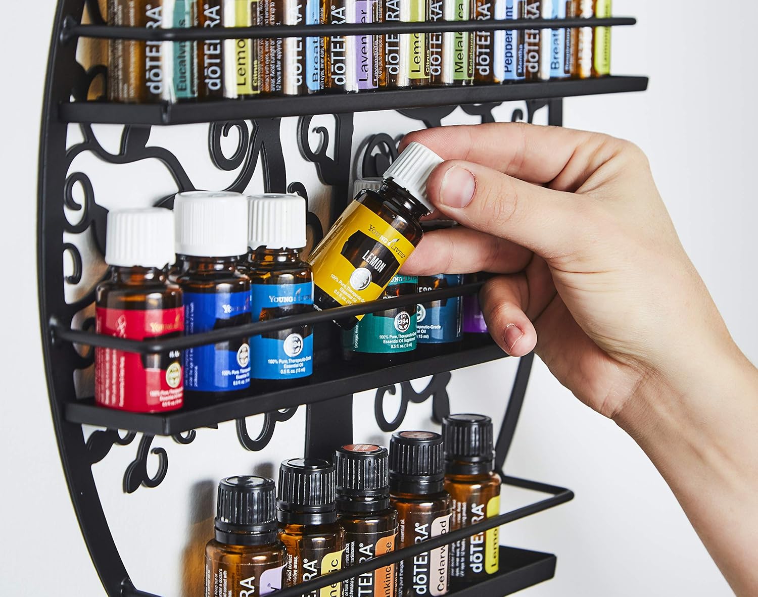The sturdy shelves give plenty of room for every essential oil AND nail polish bottle. Have easy access to find the right oil or nail color.