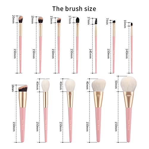 12 makeup brushes are different on the shape and size. 5 Pcs basic big makeup brushes for liquid foundation, powder and 7 Pcs precise eye makeup brushes for eye shadow,crease shadow, etc.