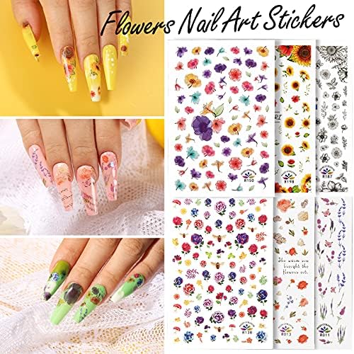 6 Sheets Nail Art Sticker Decals: Cute, elegant and delicate flowers and leaves design, each pattern is bright and clear, high quality made. Looks like real flowers. Shelf adhesive, thin and soft, easy to apply.