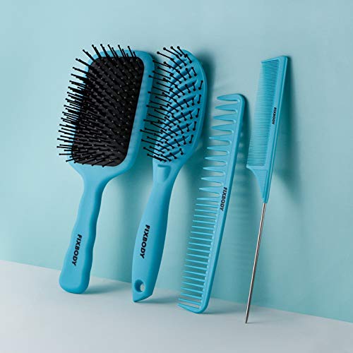 FIXBODY 4PCS Paddle Hair Brush, Detangling Brush and Hair Comb Set for Men and Women, Great On Wet or Dry Hair, No More Tangle Hairbrush for Long Thick Thin Curly Hair, Blue