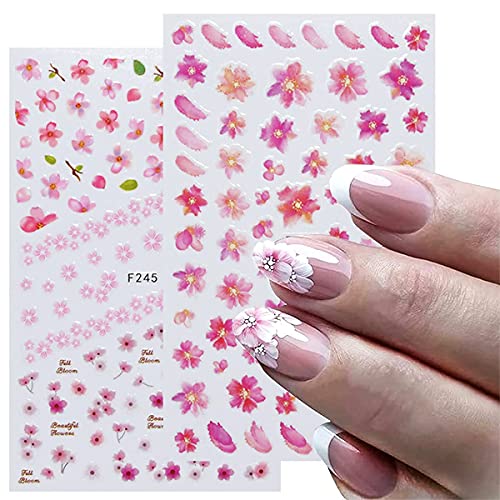 Flower Nail Art Stickers Decals 4 Sheets White Cherry Blossoms Nail Art Supplies 3D Self-Adhesive Nail Decorations Accessories DIY Acrylic Nail Art Applique (Pink)