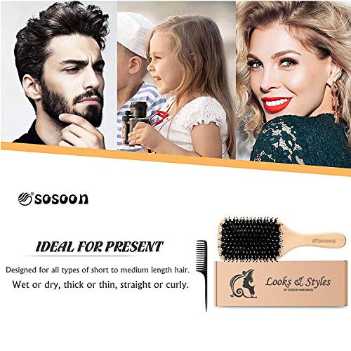 Hair Brush, Sosoon Boar Bristle Paddle Hairbrush for Long Short Thick Thin Curly Straight Wavy Dry Hair for Men Women Kids, No More Tangle, Giftbox & Tail Comb Included