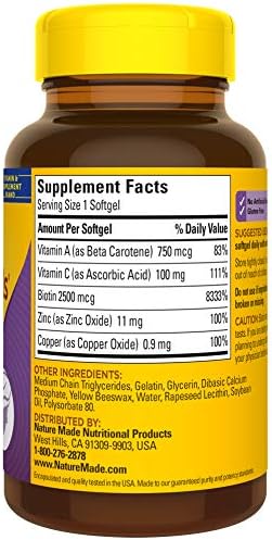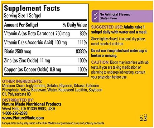 Nature Made Hair, Skin and Nails is formulated with five key nutrients for supporting healthy hair, skin and nails‡† in one small softgel. Supports collagen synthesis with vitamin C.† Taking a supplement containing 2500 mcg of biotin may help support healthy hair, skin and nails.♦† Zinc helps support healthy skin.† Copper is essential for collagen synthesis and skin support.† Beta-carotene, a precursor to vitamin A, is a key nutrient for healthy skin.†