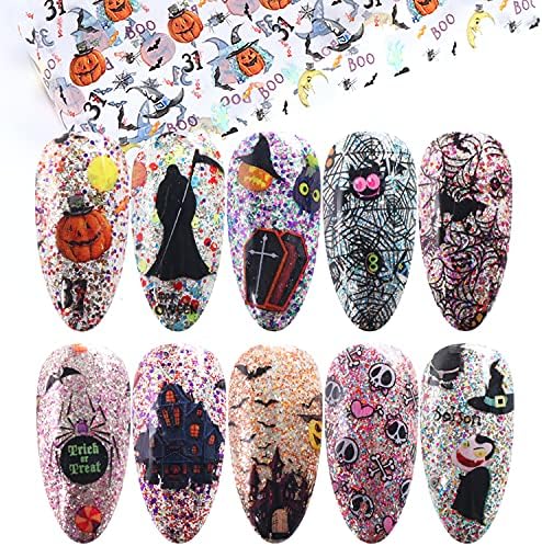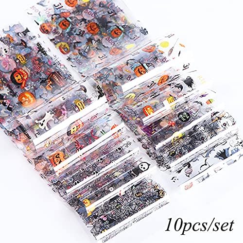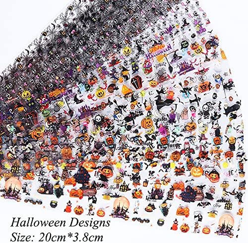Halloween Nail Art Stickers Decals 10 Sheets Foil Transfer Nail Decoration with Pumpkin/ Spider Web/Skull/Ghost/Castle/Design for DIY Manicure Tips Supplies