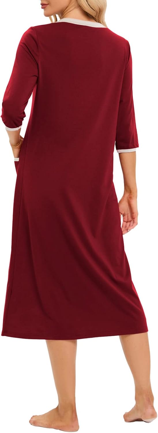 Hellomamma Women Zipper Robe 3/4 Sleeves Loungewear Dress Full Length Sleepwear Pockets Housecoat Nightgown Long Bathrobe