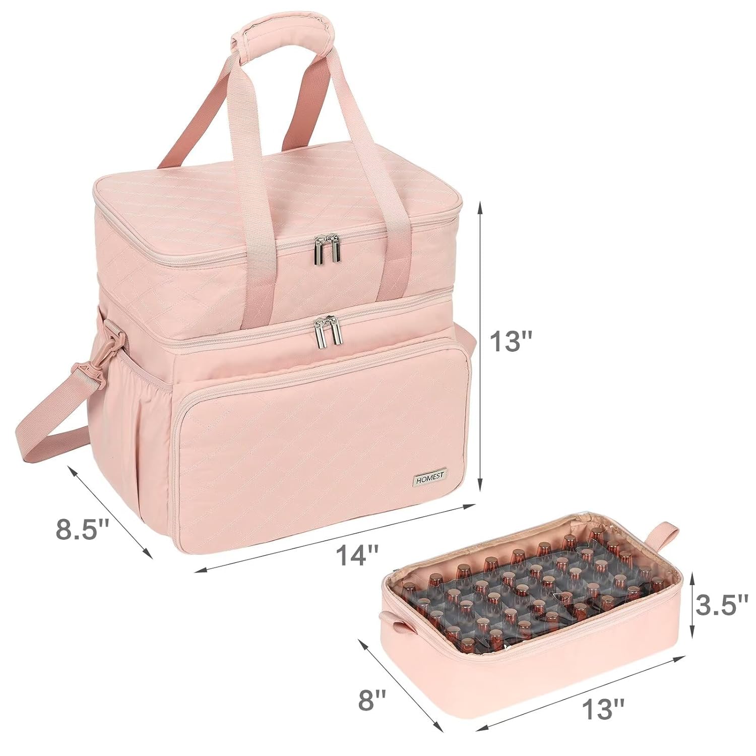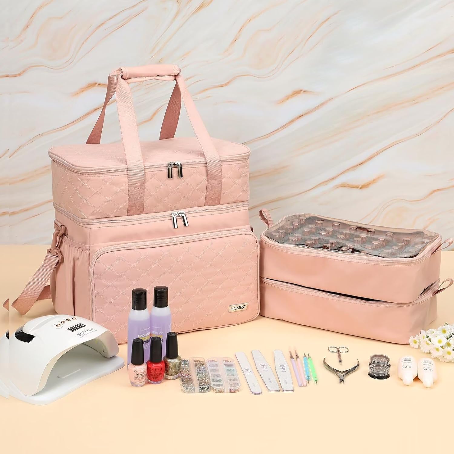 HOMEST Double Layer Nail Polish Organizer Hold 80 Bottles (15ml/0.5 fl. oz) and a Nail Lamp, Nail Polish Case with 2 Removable Pouches, Storage Bag for Manicure Tools, Pink (Bag Only)