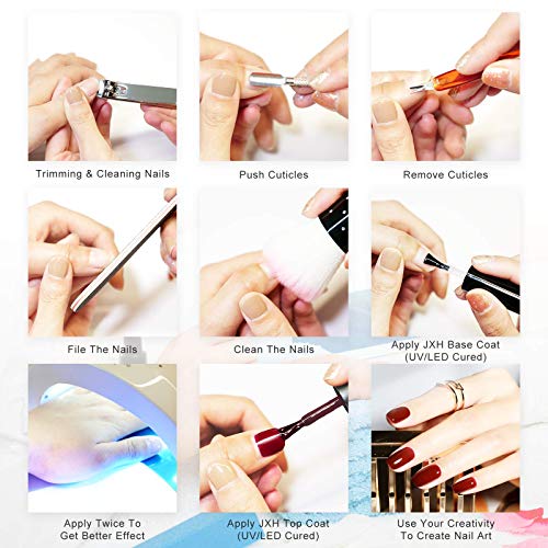 CREATE NAIL ART BY YOUR OWN: JXH gel nail polish dries very fast, the curing time for the LED lamp is only 30-90s, which is quicker and easier to apply, and has no nasty smelling fumes. You can apply many beautiful looking by mixing any decorations or other color gel polish to create a more brilliant style.