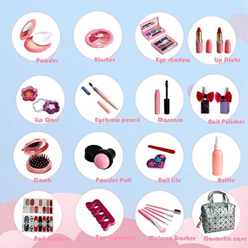 ???? SAFE & NON-TOXIC WASHABLE KIDS MAKEUP KIT : Our girl toys makeup set is washable, safety-tested, non-toxic, water-based material and soft to skin. our girls makeup kit made especially for children, everything in it is formulated with safety in mind. all of the products comply with all U.S. toy safety standards and are free of lead, cadmium, phthalates and other toxic compounds,Worry not, Mom/Grandma! Your princess is completely safe from rashes and irritation.