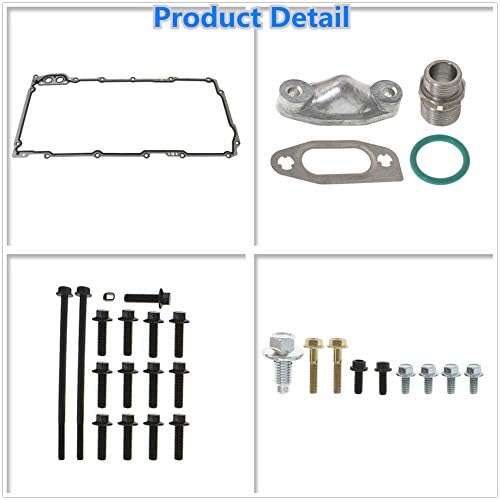 Oil pan kit including: oil pan, oil pan gasket, sump baffle, pick-up tube, sump plug, oil filter stud, oil passage cover, mounting hardware