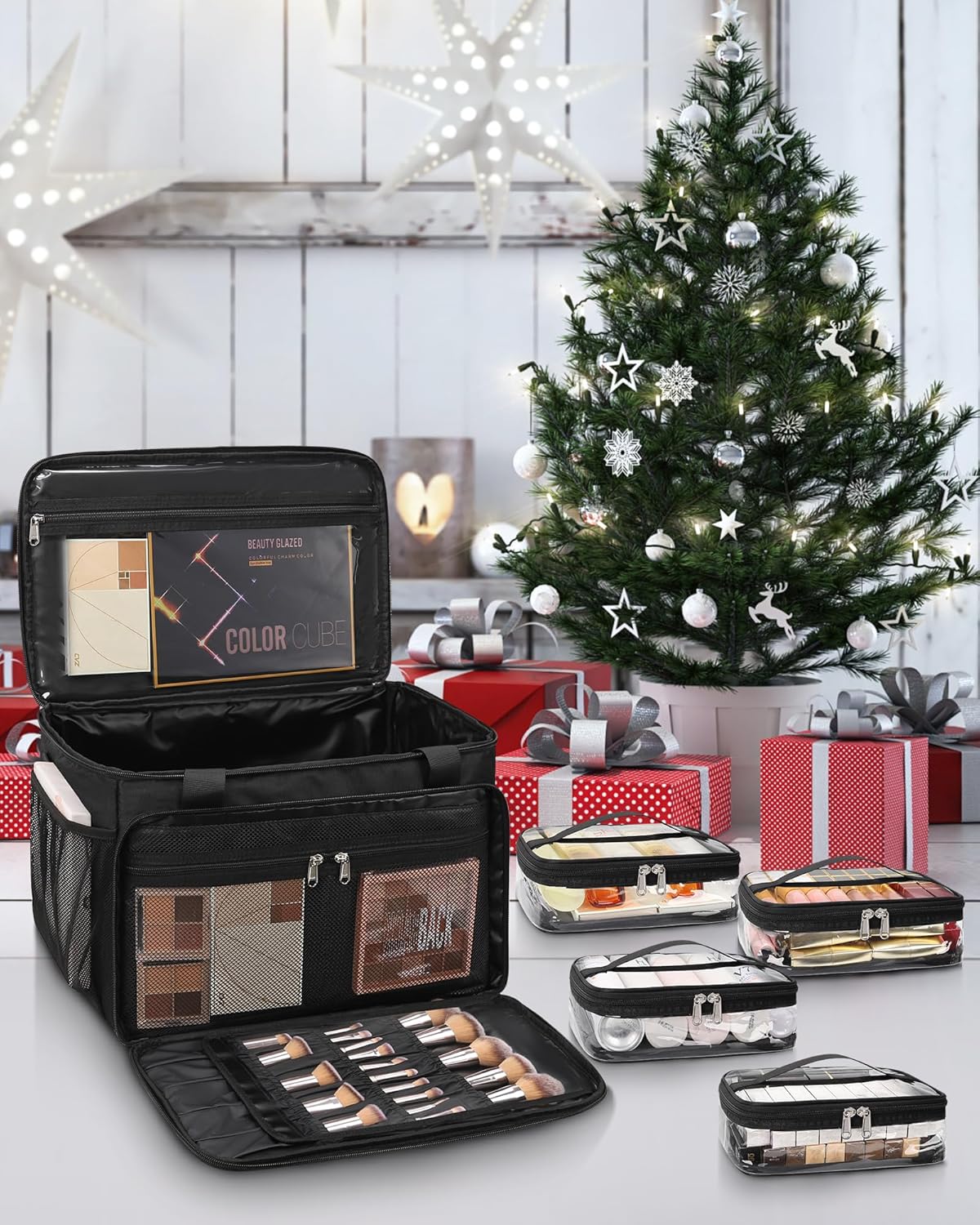 【Large Capacity】: Professional makeup bag size: 11*16.5*10.5 inches, the cosmetic bag provides multi-functional pockets, 1* top clear pocket, 2* side stretch mesh pockets, 2* zipper mesh pockets, 15* brush slots and dust cover, large-capacity cosmetic bag can be put into a variety of cosmetics, suitable for makeup artists to use