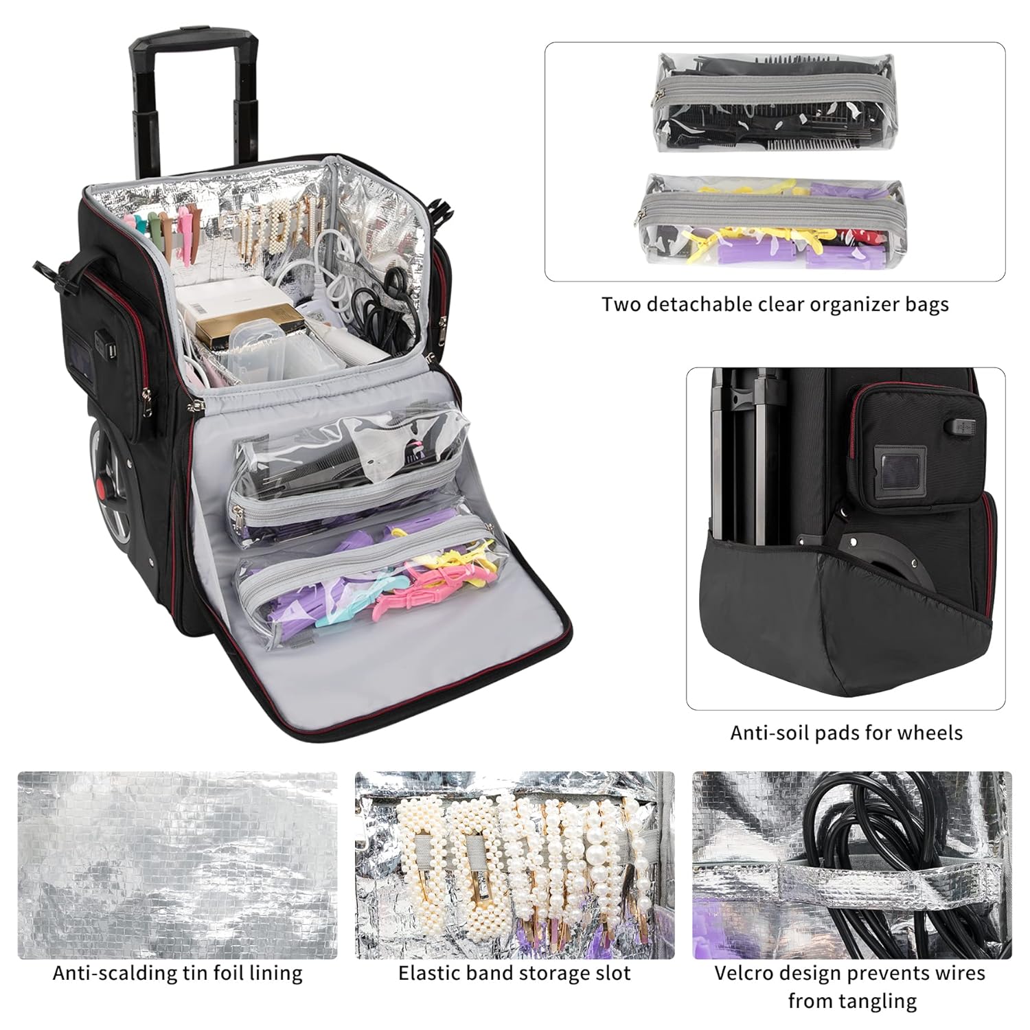Large Makeup Train Case with a Large Makeup Travel Bag for Hairstylist, Hairdresser Bag with Detachable Pouch,Heat Insulation and Anti-scalding Full layer for Hairdressing Tool Organizer, Big wheels