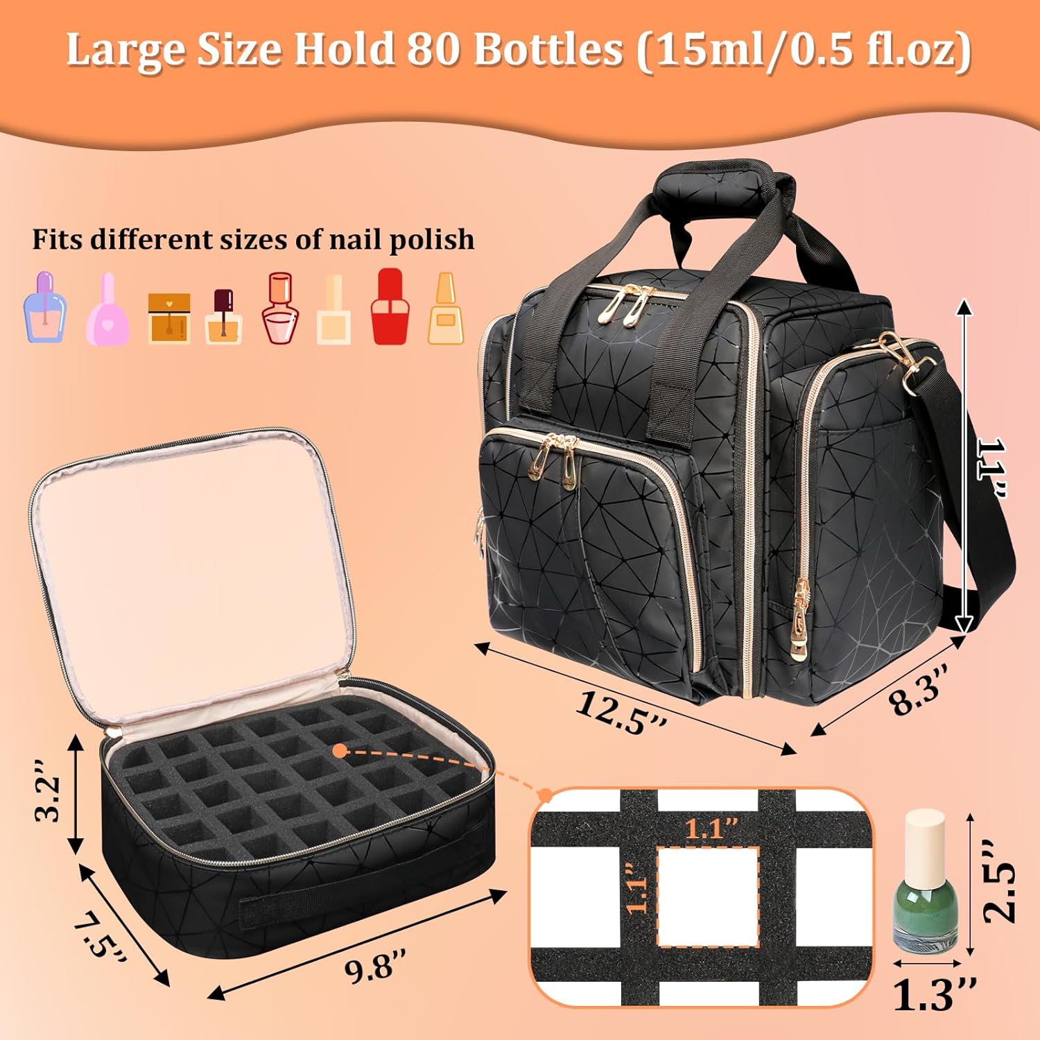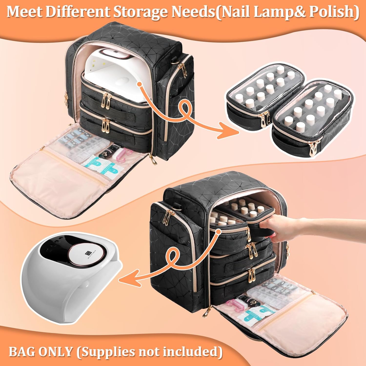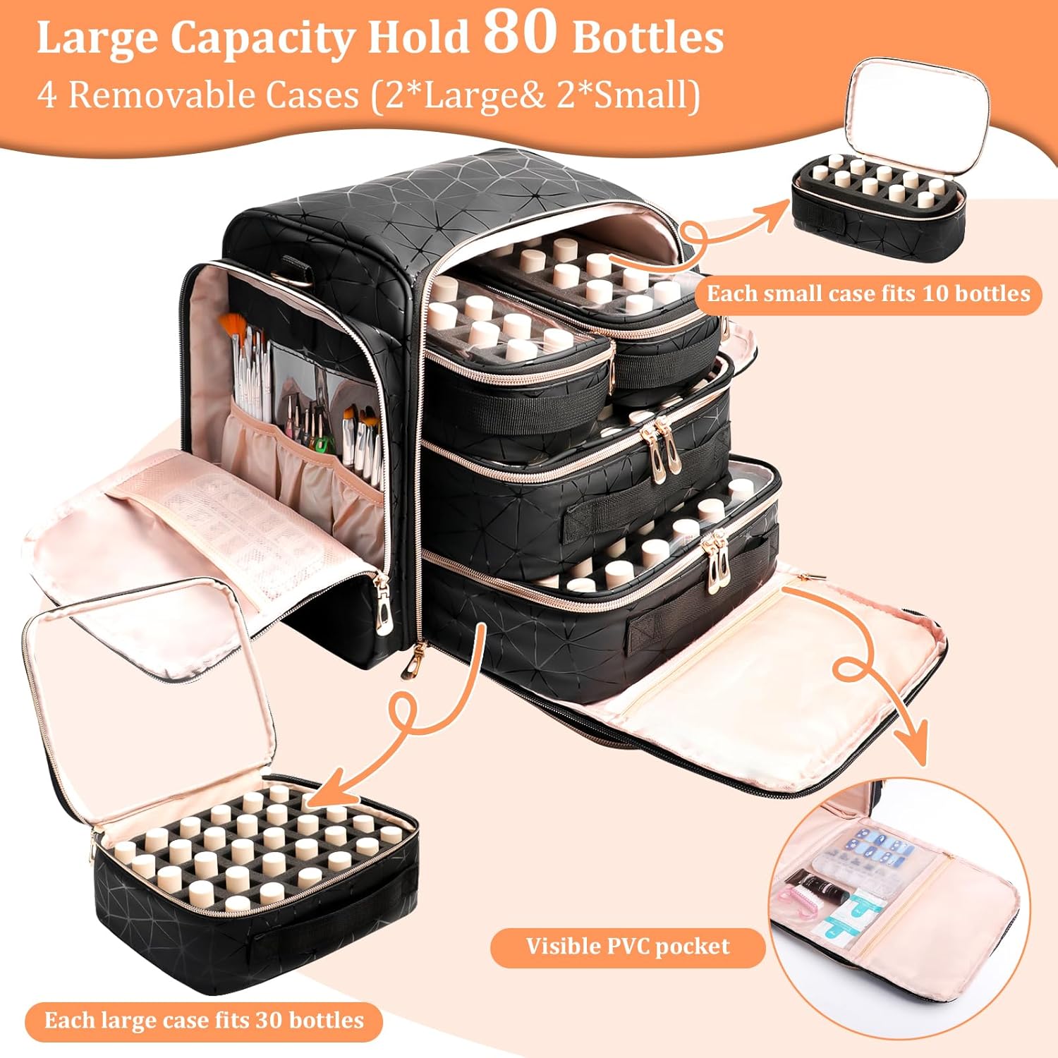 【Perfect for Nail Lamp& Polish Holder】The internal nail polish storage case is removable with portable carrying handle, which can save space storage a large nail lamp. You can also take out the soft foam to organize more nail supplies. It can hold 80 bottles with nail UV light.