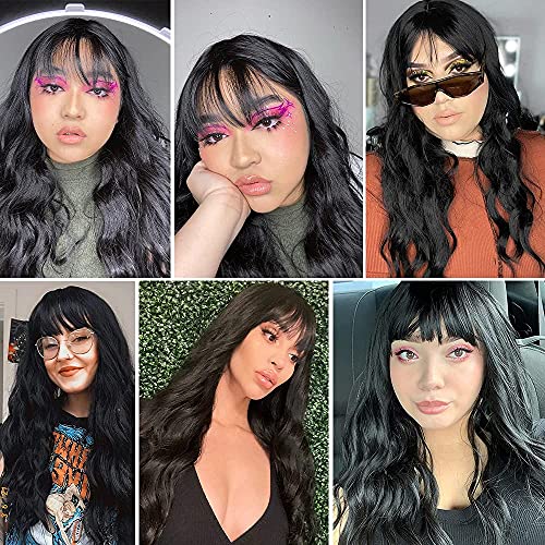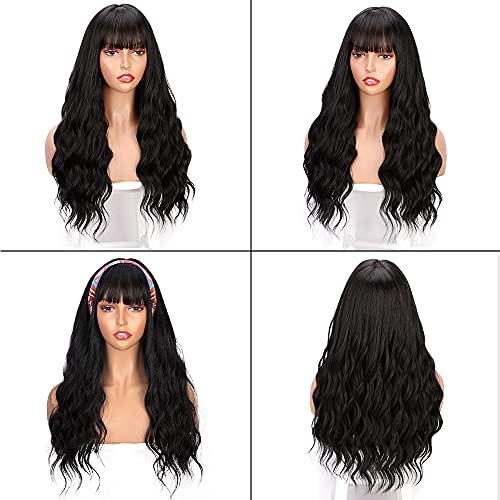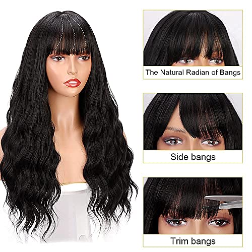 LNERATO Black Wig with Bangs Wavy Long Black Wigs for Women Girls Synthetic Heat Resistant Wig for Daily Party Use 24inches (wigs with bangs)