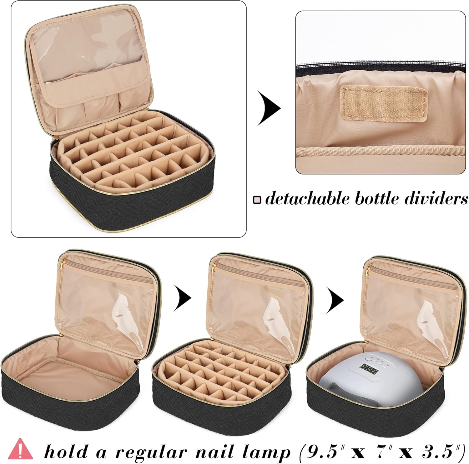 DETACHABLE DESIGN: A middle zipper connects 2 nail polish bags together. Each bag (with bottle dividers) holds up to 30 bottles of 15ml (0.5 fl.oz) nail polish.