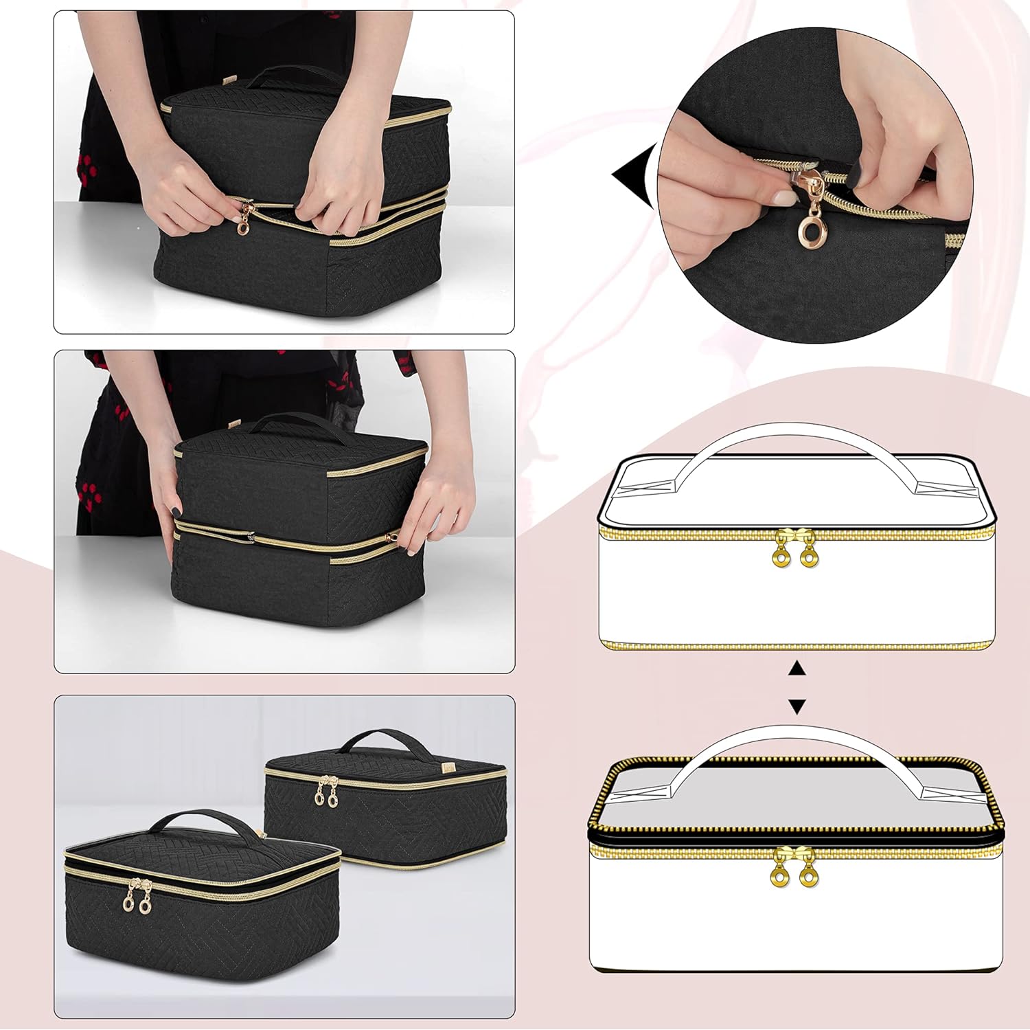 TOOL STORAGE: The upper part has a section for holding brushes and dotting tools. The bottom part’s zipper pocket provides ample space for other manicure accessories.