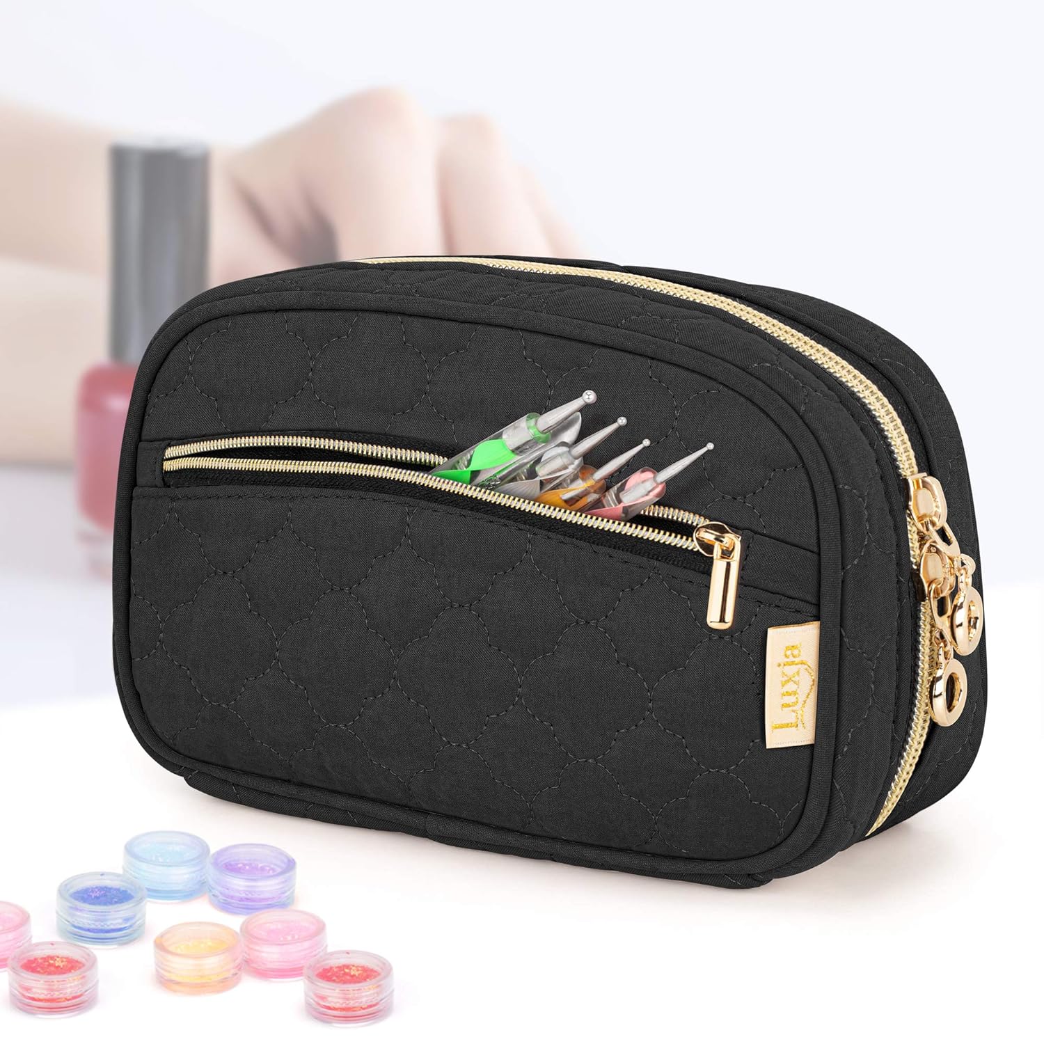 TOOL STORAGE: An inner zipper pouch and an exterior zipper pocket to hold the stickers, polish remover and other small manicure accessories.