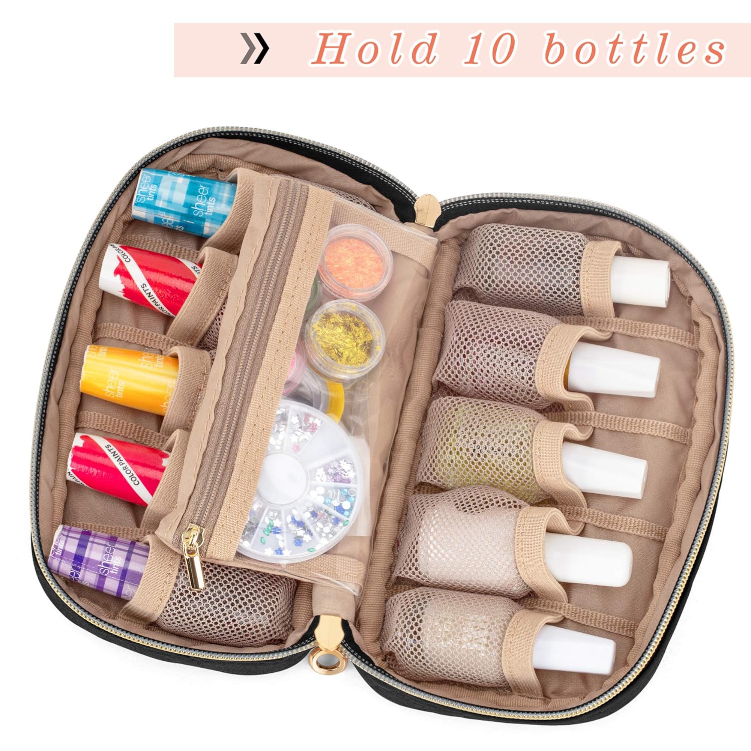 CAPACITY: 10 mesh slots (with elastic tops) for storing 10 bottles of nail polish (15ml / 0.5 fl.oz).